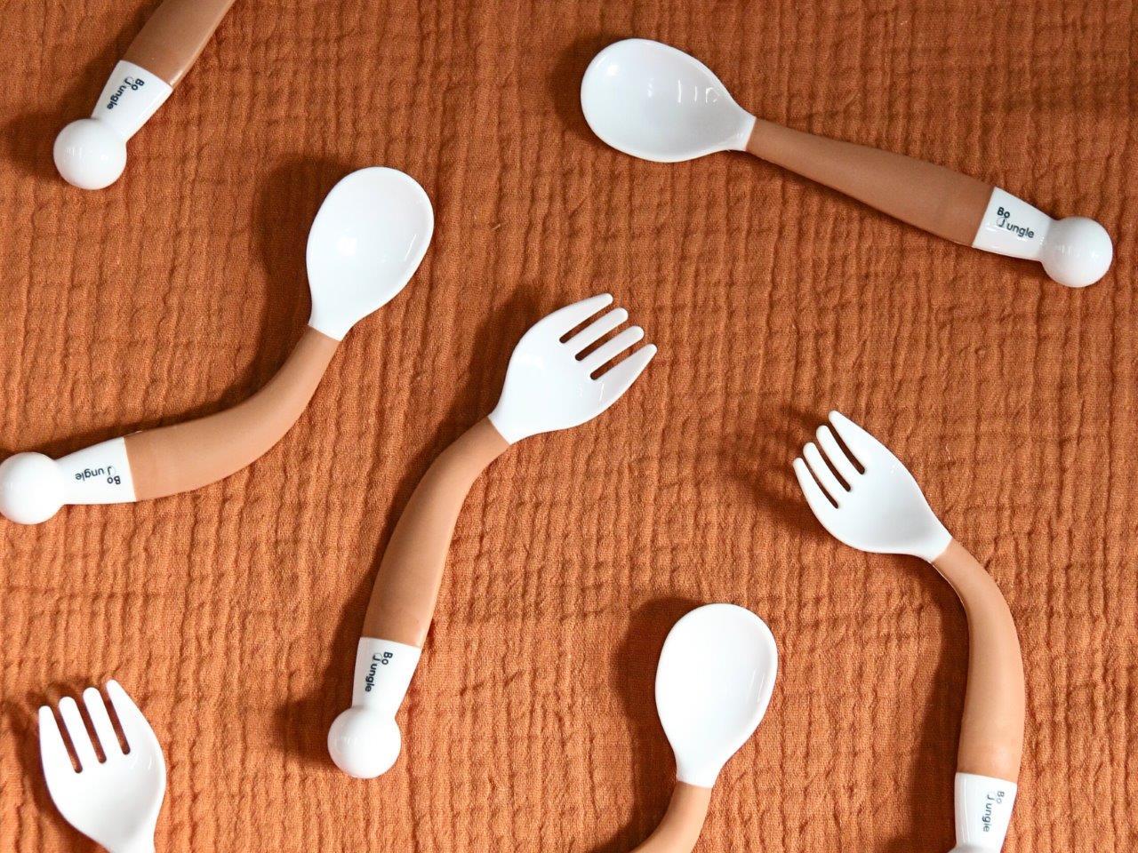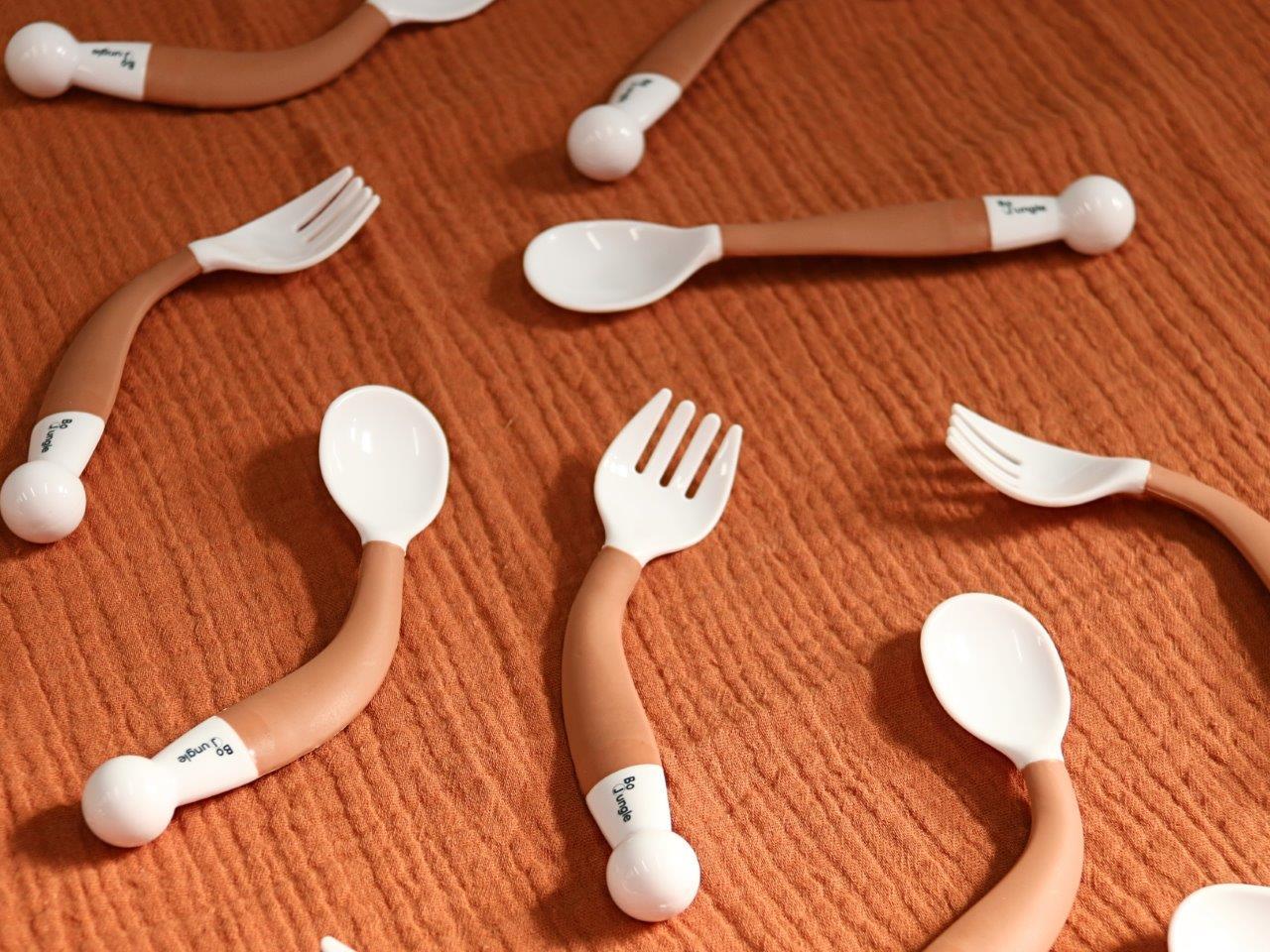 Zestaw sztućców dla dzieci Bo Jungle to idealne sztućce dla maluchów, aby mogły nauczyć się jeść! Sztućce zostały wykonane ze specjalnego tworzywa, które po zgięciu utrzymuje nadany kształt, dzięki temu ułatwi dziecku naukę jedzenia. Dodatkową zaletą jest możliwość dostosowania do potrzeb dziecka, niezależnie od tego czy jest prawo czy leworęczne. Posiadają specjalnie zaokrąglone kształty, by nie podrażniać delikatnych dziąseł małego dziecka.