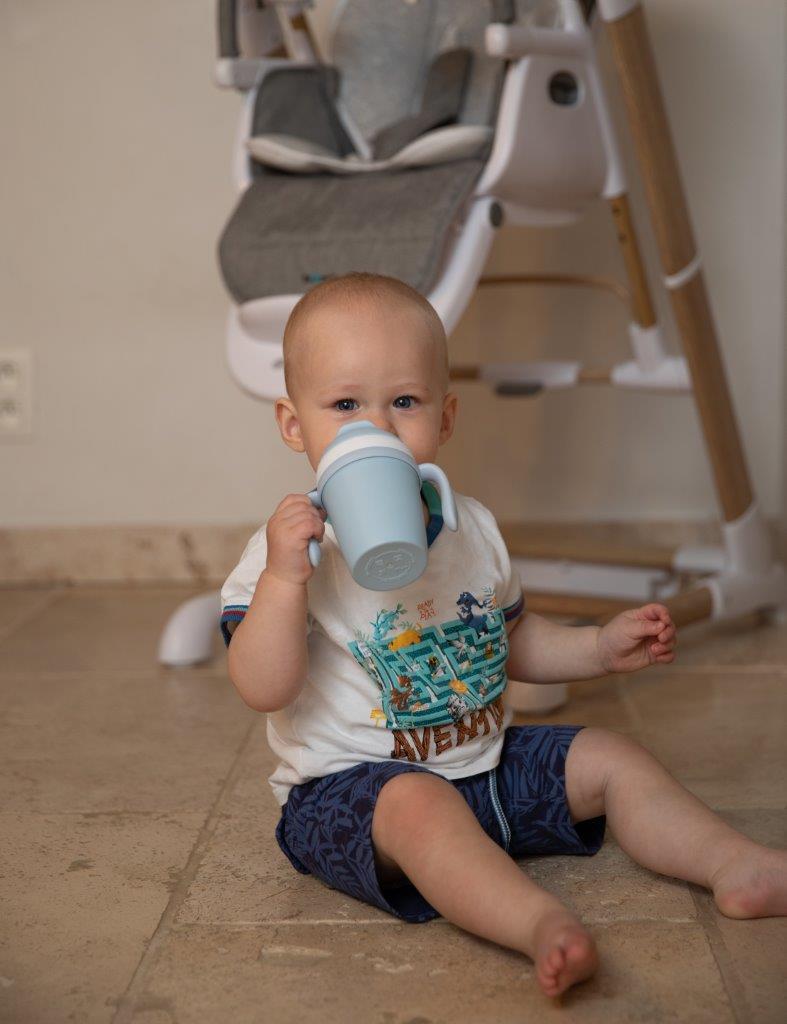 Kubek treningowy ma pojemność 250 ml. Jest to kubek do nauki samodzielnego picia z miękką silikonową słomką i systemem niekapiącym. Słomka jest całkowicie zdejmowana dla łatwego czyszczenia i zachowania idealnej higieny. Po przekręceniu górnej części kubka pokrywka zakrywa słomkę, blokuje się i jest szczelna. Dwa uchwyty na bokach sprawiają, że kubek jest łatwy do przenoszenia i utrzymania w małych rączkach.