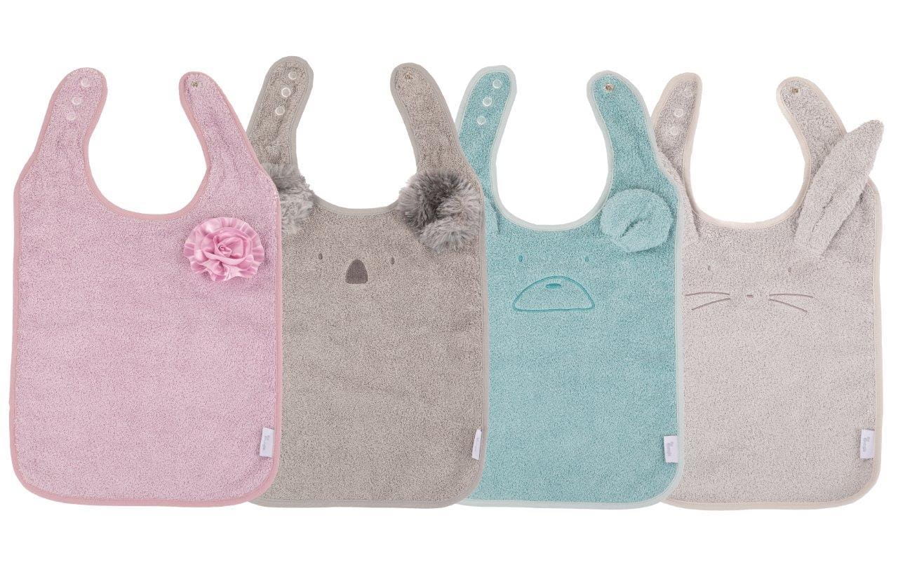 Kolekcja obejmuje 4 pastelowe kolory ozdobione haftem i z uszkami misia, królika, koali lub z kwiatkiem.
