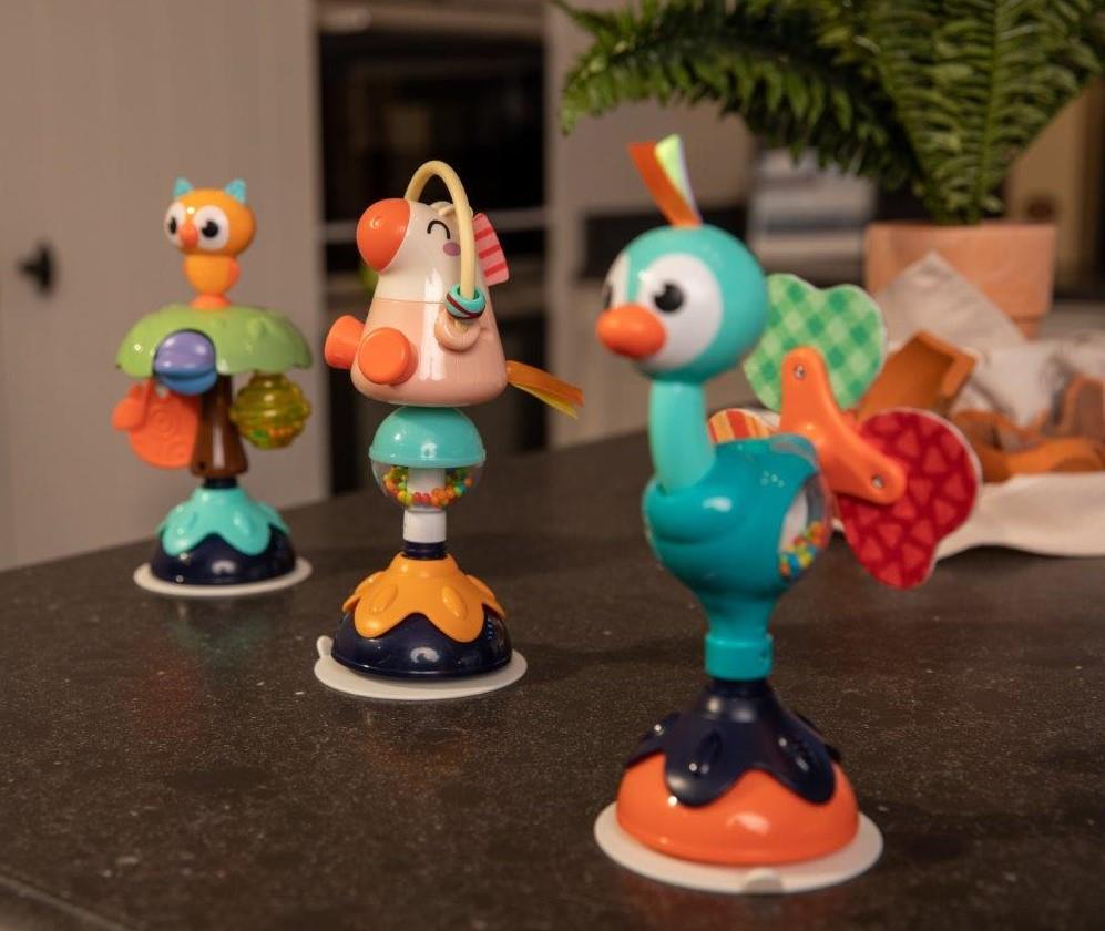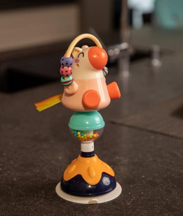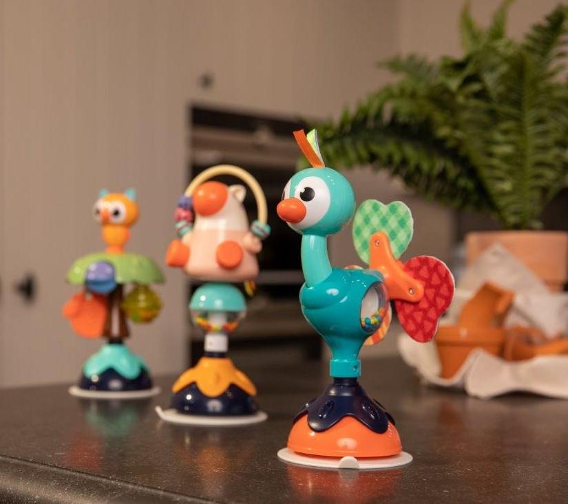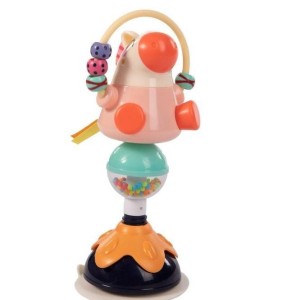 Zabawka może być mocowana do stołu lub blatu krzesełka za pomocą przyssawki, która jest dodatkowo stabilizowana za pomocą dokręcanego elementu zabawki (żółty kwiatek na kulistej podstawie), dzięki temu pozostaje ona stabilnie w miejscu, gdzie została umieszczona.