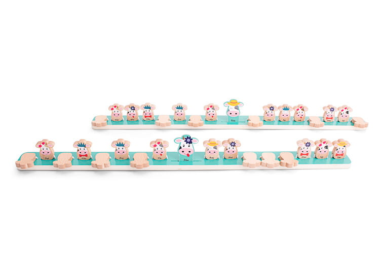 Logiczna gra dla najmłodszych dzieci. Duże elementy są wygodne nawet dla mniejszych rączek. Prosta gra, w którą można grać z maluchem godzinami i nigdy sie nie nudzi. Jest wykonana 100% FSC i charakteryzuje się uroczą grafiką. Słodkie krówki umieszczone są na dłuuuuugiej drewnianej podstawie ( 57 cm) przy pomocy gumek. Dzięki temu możesz zabrać grę ze sobą również w podróż i żaden element się nie zgubi. Gra jest przeznaczona dla dwóch graczy. Każdy z nich otrzymuje drewnianą podstawę z krowami i losuje jedną kartonową krówkę a następnie wkłada ją w swoją podstawę. Pamietaj, aby nie pokazywać wybranej krówki przeciwnikowi, bo to właśnie o nią będą zadawane pytania. Zadawane pytanie muszą być tak sformuowane, aby odpowiedź brzmiała tak lub nie. Po eliminacji krówek kładziesz wybrane krówki pyskiem do dołu. I tak na zmianę aż odgadniecie kartonową krówkę u przeciwnika.