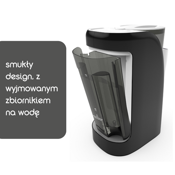 4. Urządzenie dozuje mleko modyfikowane z hermetycznego pojemnika na proszek do lejka i miesza je z wodą w wybranej przez Ciebie temperaturze