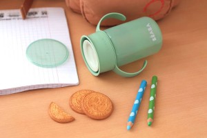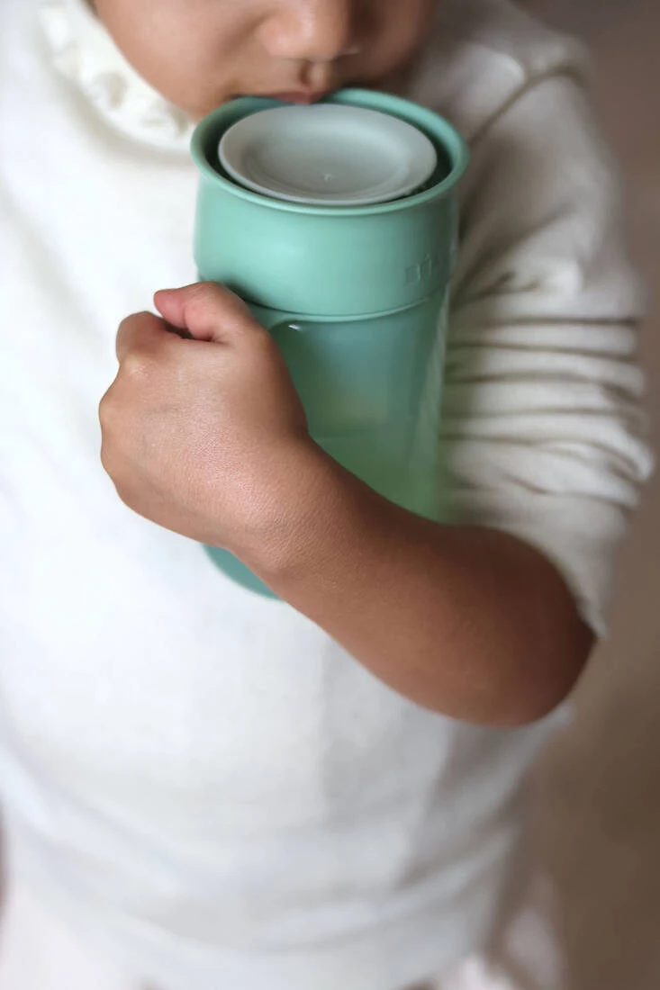 Kubeczek ma kolor szałwiowej zieleni. Można go myć ręcznie i w zmywarce, w delikatnym cyklu.