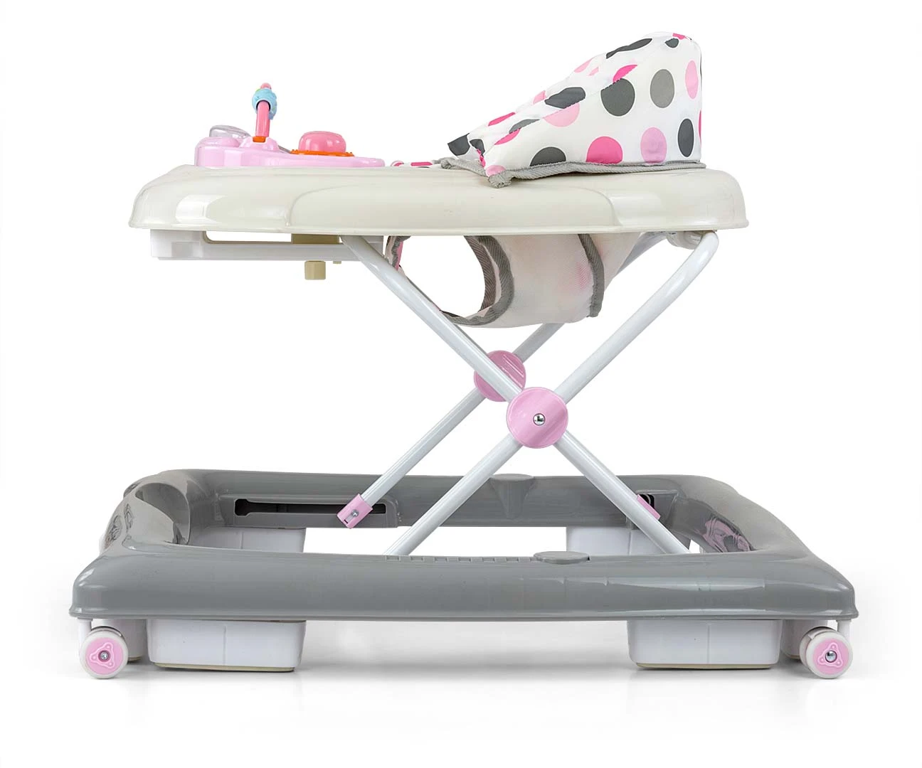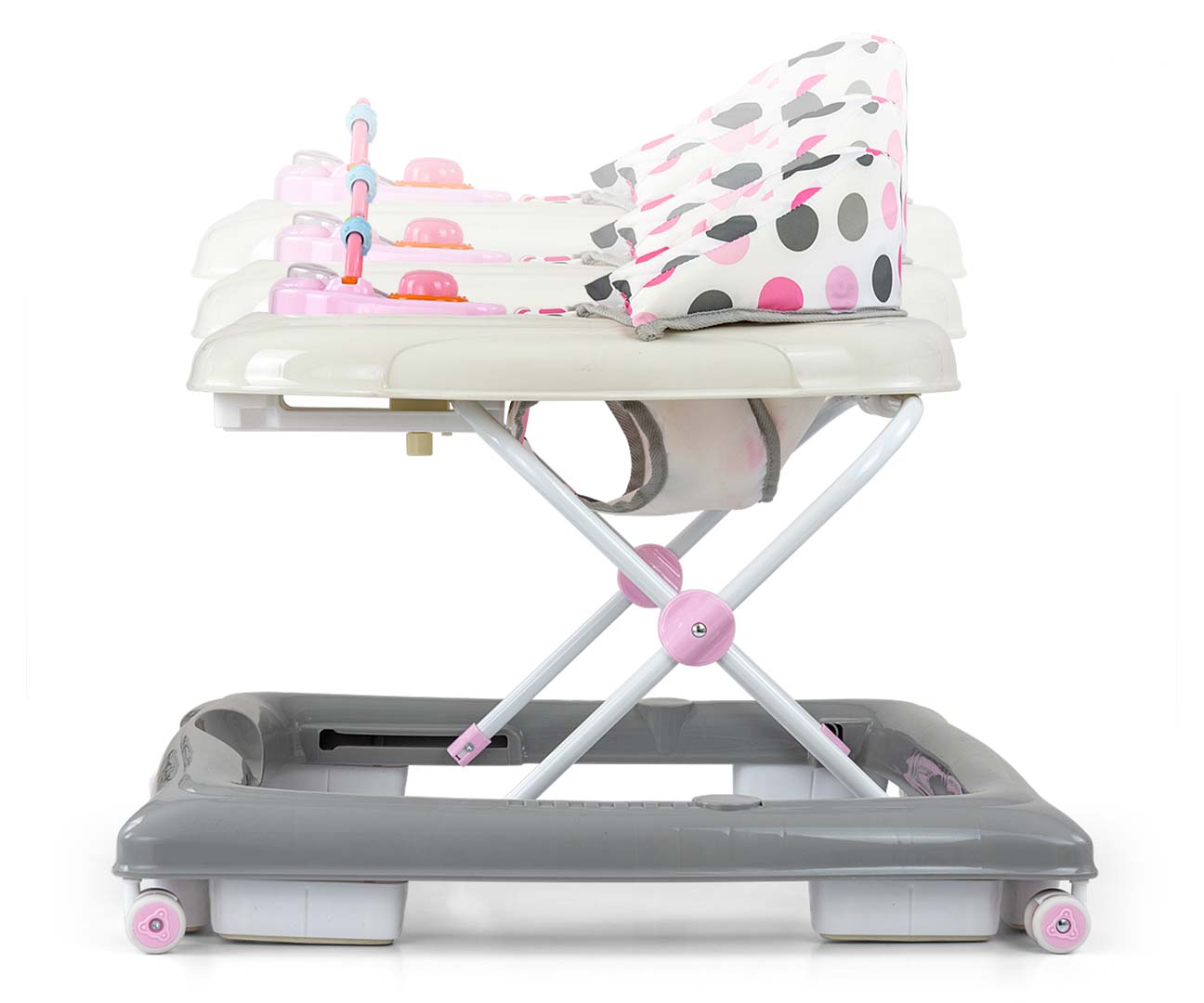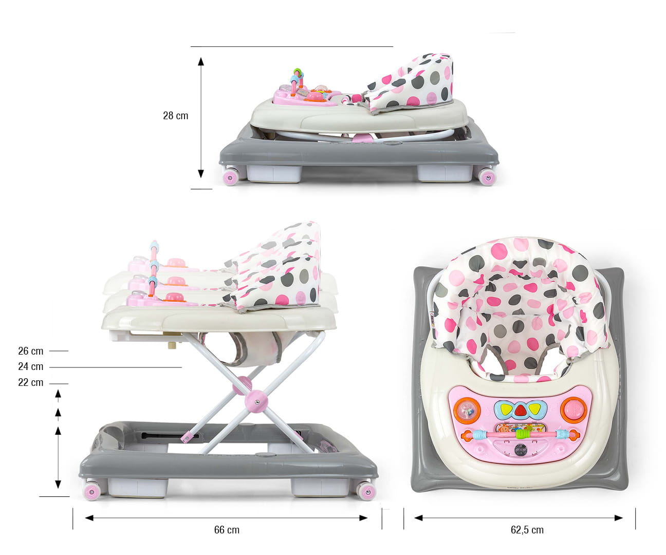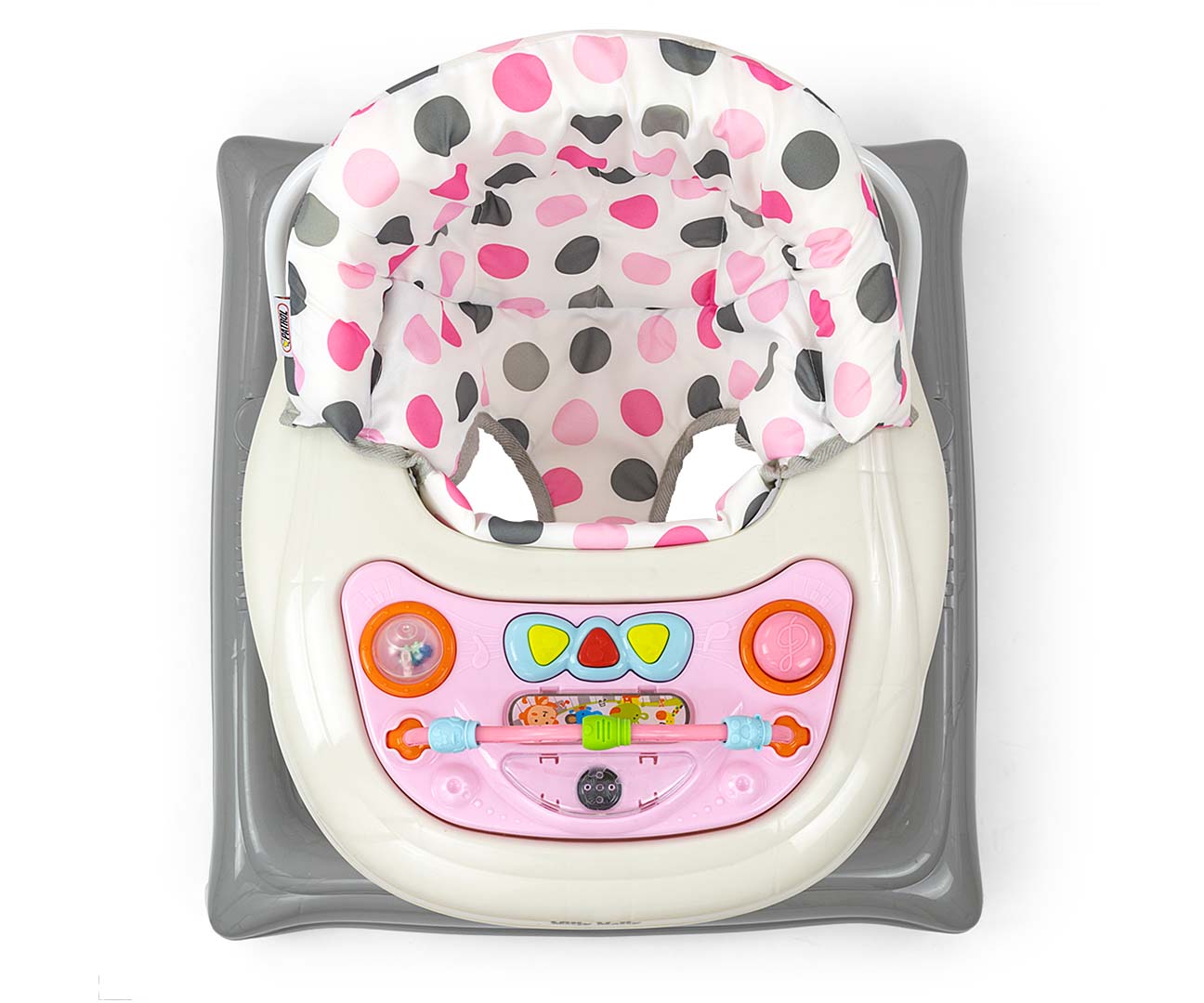 Produkt posiada edukacyjny panel, który zawiera szereg niespodzianek czekających na małych odkrywców: światełka, piszczałki, melodyjki, grzechotka, przyciski i inne ruchome elementy. Po wypięciu panelu z tacki chodzika posłuży on jako niezależna zabawka, np. jako umilacz w podróży, a blat przyda się jako stolik do zabaw.