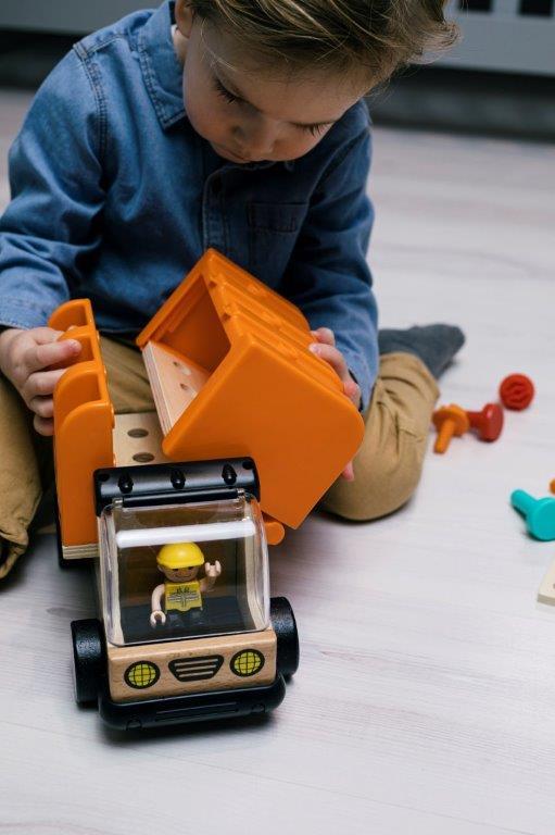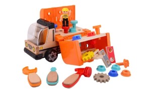 Ciężarówka z warsztatem narzędziowym to wytrzymałe i solidne auto wykonane z połączenia drewna i plastiku najwyższej jakości. Część załadunkowa otwiera się na boki i tworzy warsztat narzędziowy. Wypełniona jest narzędziami typu młotek, śrubokręt, klucz, kolorowe nakrętki, kołeczki i śruby, deseczki z otworami, a drewniany element konstrukcyjny auta i wstępnie wywiercone w nim otwory jest ruchomym placem budowy i zabawy. Kabina ciężarówki jest otwierana, a dodatkowo do zabawy przydaje się kierowca-budowniczy wyposażony w kask. Dzięki dołączonym kolorowym deseczkom z otworami można zbudować motocykl, konia, samolot, żyrafę, wiatrak pokazane w instryukcji lub wiele innych w zależności o pomysłu i fantazji małego budowniczego. Ciężarówka z warsztatem narzędziowym doskonale nadaje się do doskonalenia umiejętności motorycznych, koordynacji ręka-oko oraz zachęca do kreatywnej zabawy i zręczności manualnej.