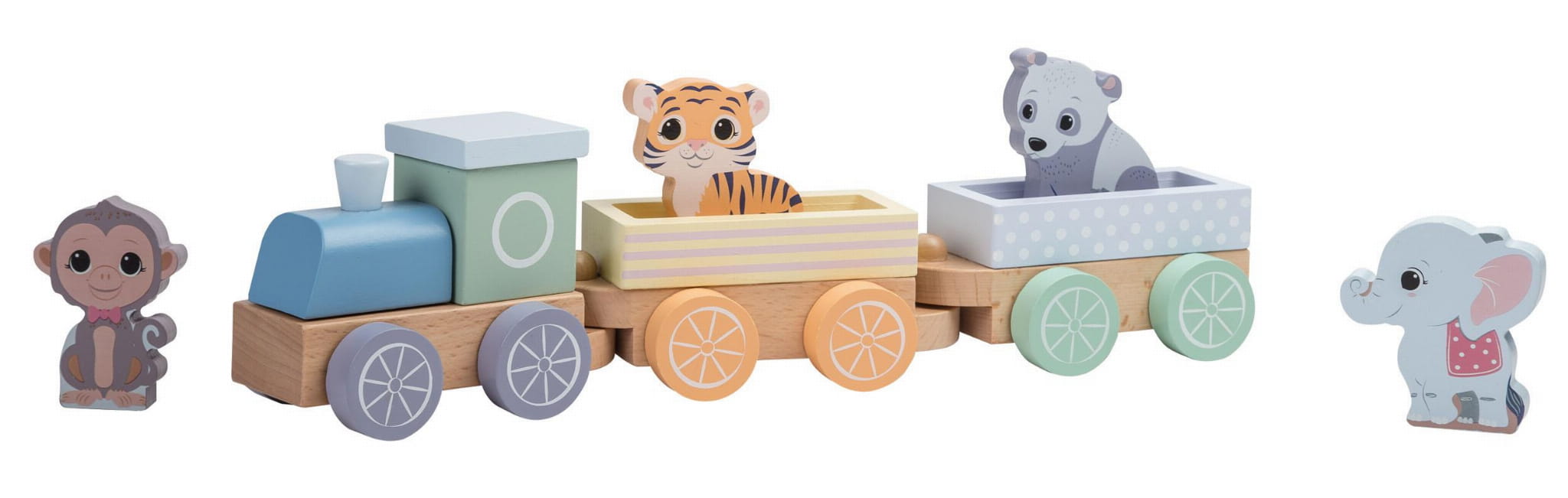 Drewniana kolejka ze zwierzątkami marki JOUECO to przepiękna zabawka, w której zakocha się nie tylko Twój maluch. Drewniany pastelowy pociąg składa się z lokomotywy i dwóch wagoników oraz drewnianych zwierzątek: małpki, tygryska, pandy oraz słonia. Dzięki tej zabawce Twój maluszek rozwinie m.in. zdolności motoryczne czy koordynację ręka-oko.
