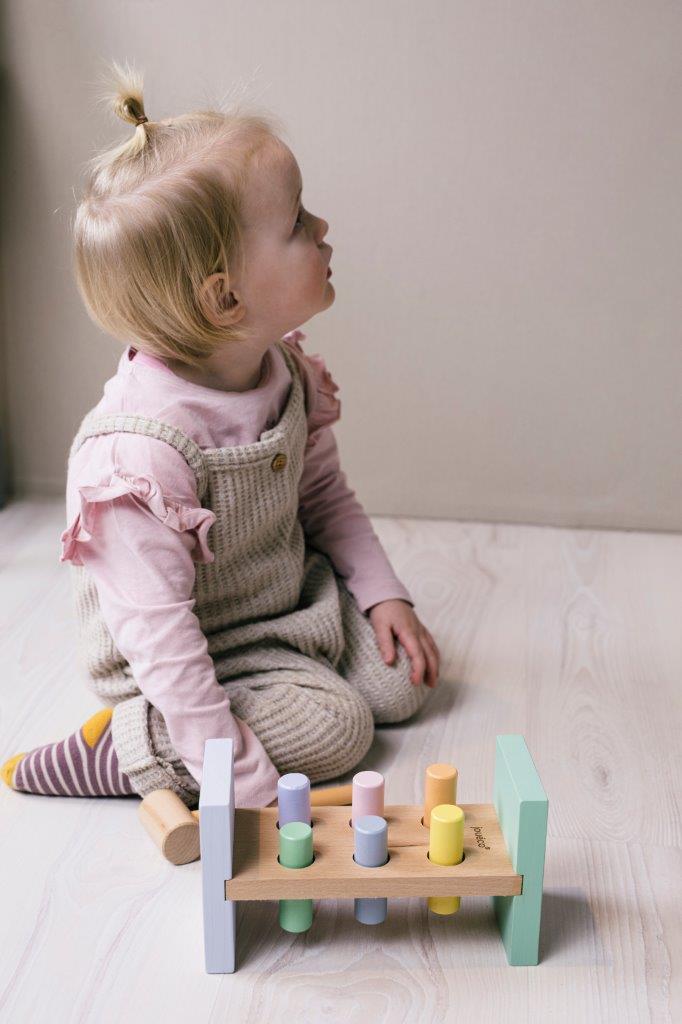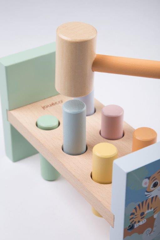 Przebijanka od marki JOUECO to wyjątkowa zabawka, która pomoże Twojemu dziecku rozwinąć najważniejsze w jego wieku zdolności tj.zdolności motoryczne, koordynację ręka-oko i logiczne myślenie. Zabawka składa się z pastelowej drewnianej ławeczki, młotka oraz 6 kolorowych kołków. Należy do pastelowej kolekcji The Wildies Family z wizerunkiem zwierzaków: małpki,słonika, pandy i tygryska.