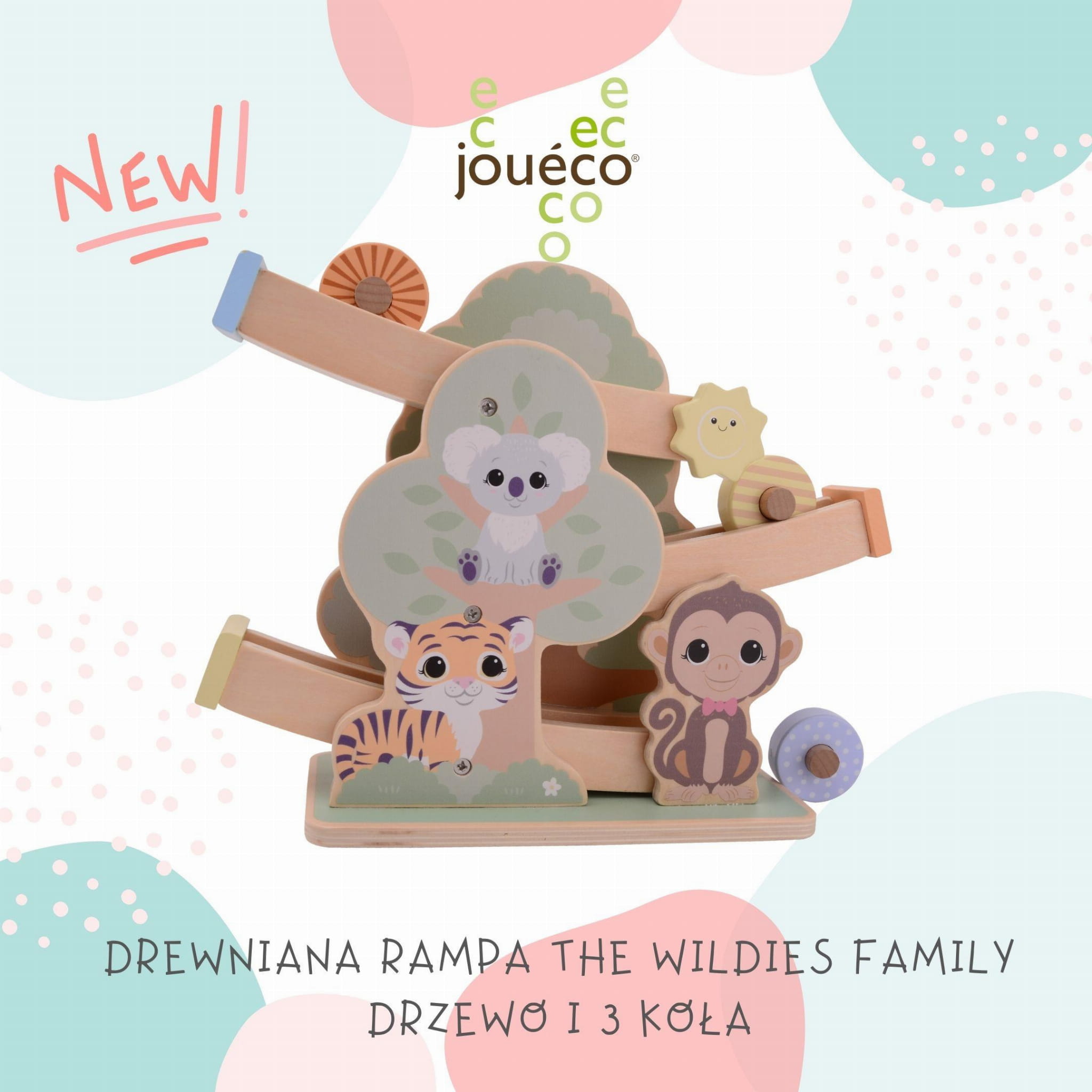 Piękna pastelowa rampa zjazdowa w kształcie leśnego drzewa ze zwierzakami z kolekcji The Wildies Family to zabawka, która gwarantuje wiele godzin kreatywnej zabawy. Rampa przypomina drzewo, a panda, małpka, tygrysek i słonik zapraszają, a toczyć koło z góry w dół. Wystarczy postawić drewniane koło/walec na górze toru i rozpocząć wyścig. Koło zjedzie szybko na sam dół pokonując kolejne przeszkody.