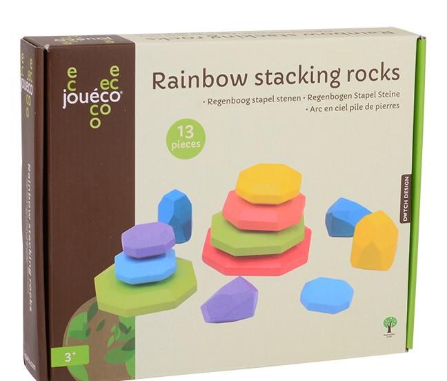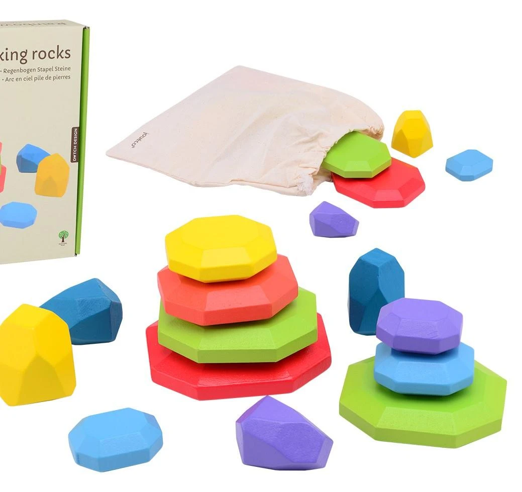 Te kolorowe drewniane kamienie o nieregulatnych kształtach pozwolą dziecku na zbudowanie tęczowej piramidy i zapewnią rozrywkę na długie godziny. Ta zabawa gwarantuje rozwój koordynacjiwzrokowo-ruchowej i motoryki. Dziecko podczas zabawy ma okazję poznać różne rozmiary i kszatłty oraz samo decyduje w jakiej kolejności powinny być one ułożone. Zabawa jest wyzwaniem dla każdego dziecka. Tęczowe kamienie w ilości 13sztuk są zapakowane w eko torbę, która ułatwi ich przechowywanie. Zabawka wykonana z certyfikowanego drewna wysokiej jakości, w pełni bezpieczna, pokryta nietoksyczną farbą.