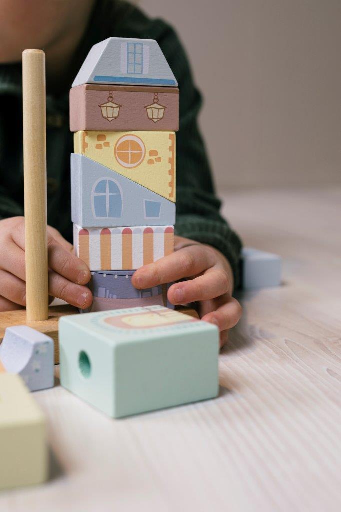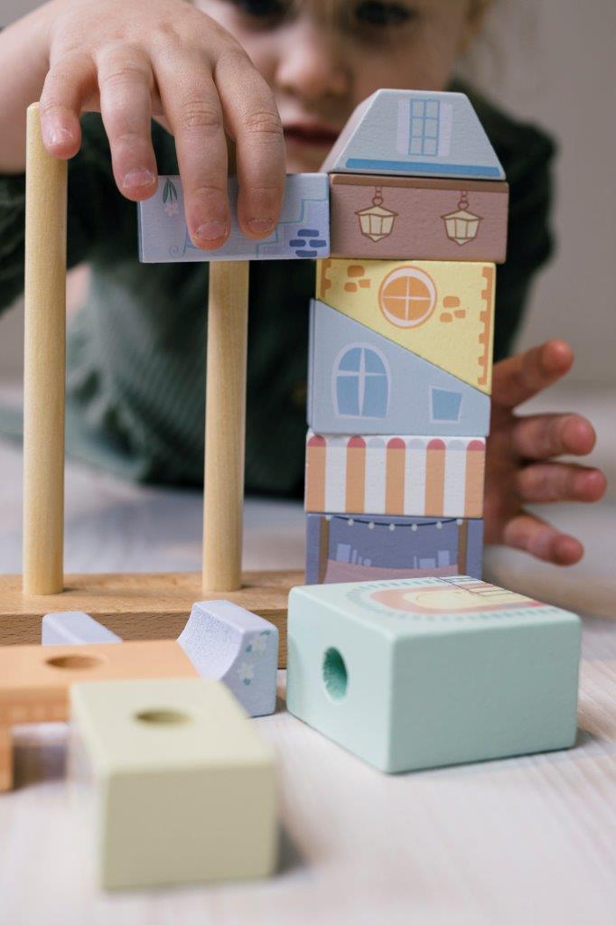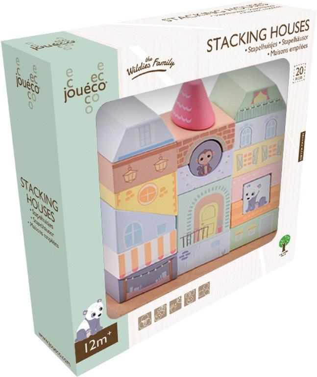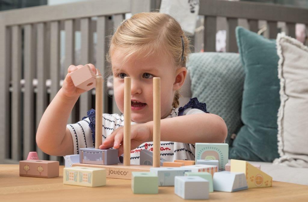 Drewniane klocki marki JOUECO tworzą stylową kamieniczkę, układanka składa się z 20 elementów. Można z nich zbudować piękną pastelową kamieniczkę, w której mieszkają: małpka, słonik, panda i tygrysek. Piękne,nadrukowane rysunki pozwalają tworzyć ciekawe historie o tym fragmencie miasteczka. Dzięki tej zabawce Twój maluszek rozwinie m.in. zdolności motoryczne, logiczne myślenie oraz koordynację ręka-oko. Złożona układanka stanowi dodatkowy uroczy element wystroju każdego dziecięcego pokoju.