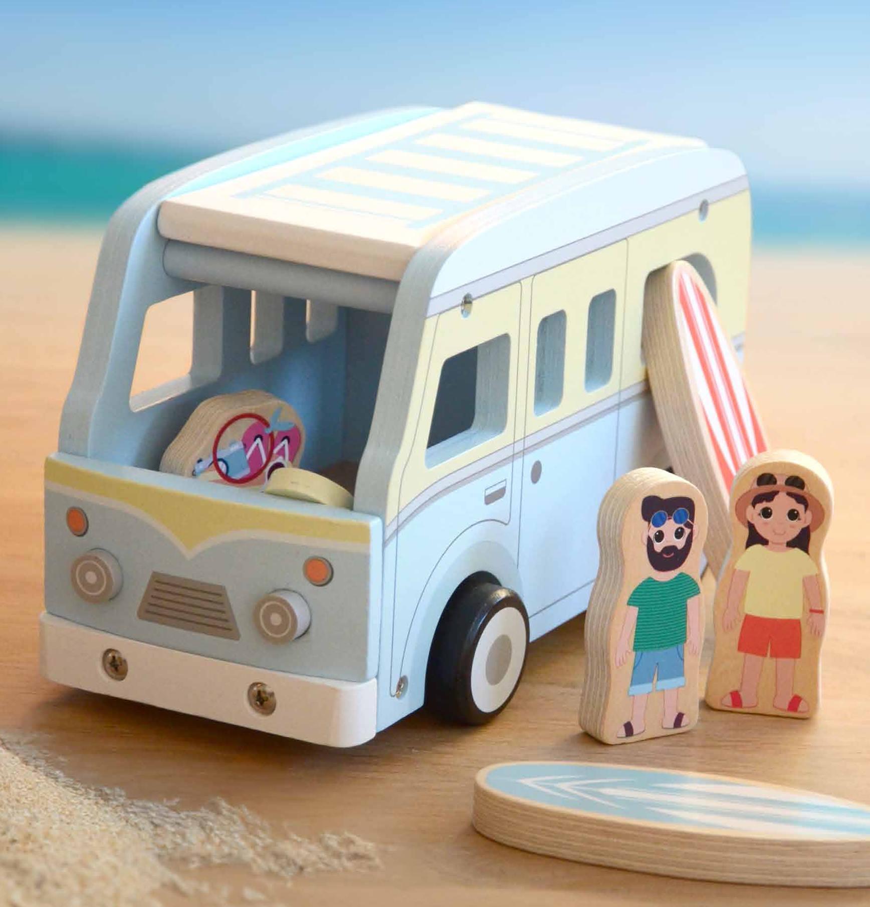 Drewniany camper bus w stylu retro to wyjątkowa zabawka w pięknych pastelowych kolorach, przeznaczona dla dzieci od 18 m-ca życia. Zabawka składa się z 7 elementów i gwarantuje długie godziny zabawy. Ten błękitny camper z otwieranym dachem i otwieraną tylną klapą wiezie rodzinę na plażę, mieści 2deski surfingowe i kosz plażowy. Całość wykonana jest w klimacie retro,zabawka będzie piękną ozdobą dziecięcego pokoju i jest idealna na prezent. Doskonale sprawdza się, aby doskonalić umiejętności motoryczne dziecka,koordynację ręka-oko oraz zachęca do kreatywnej zabawy i zręczności manualnej.