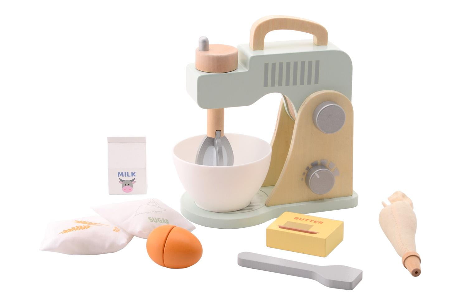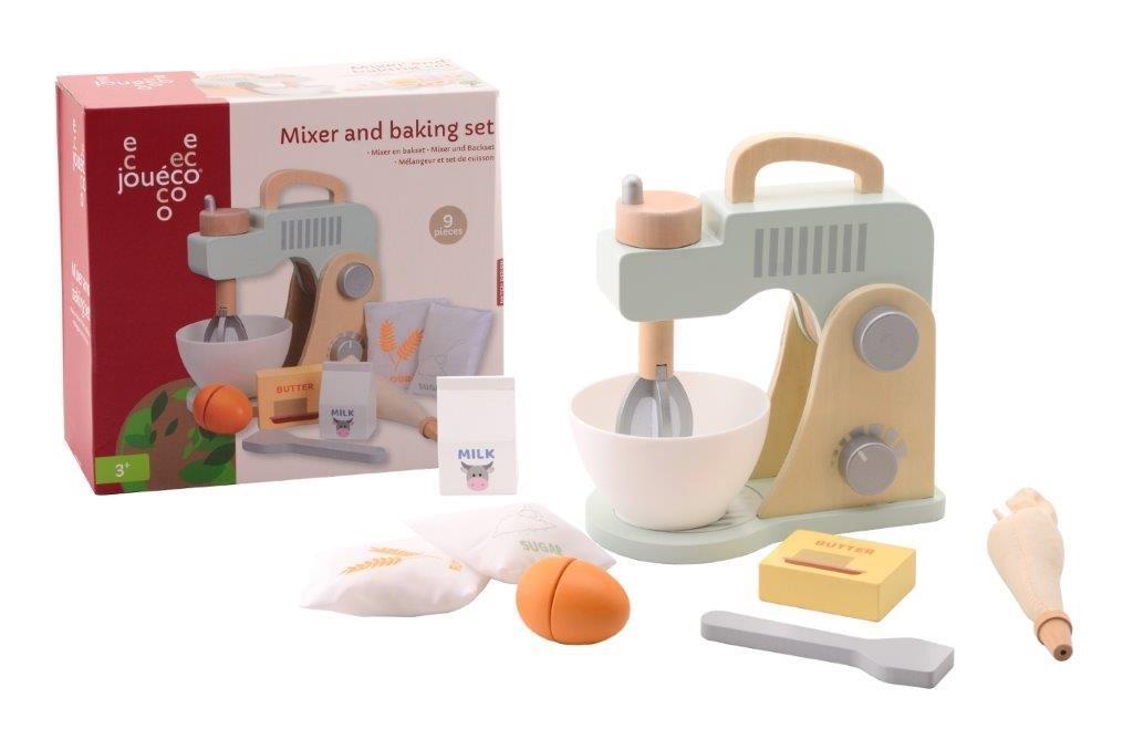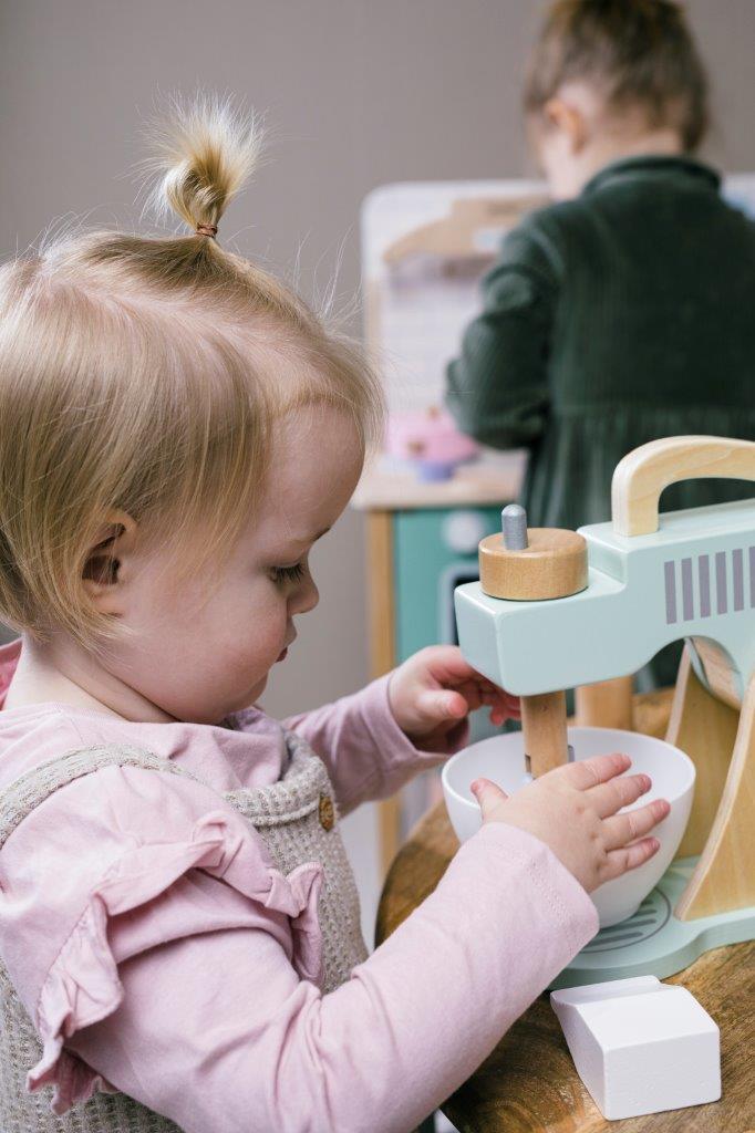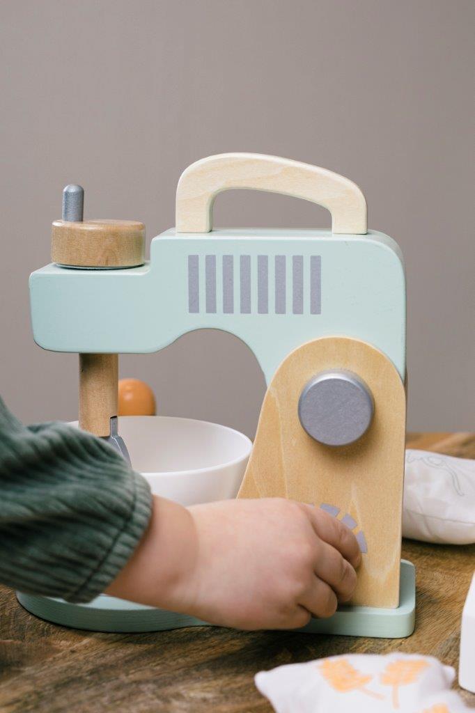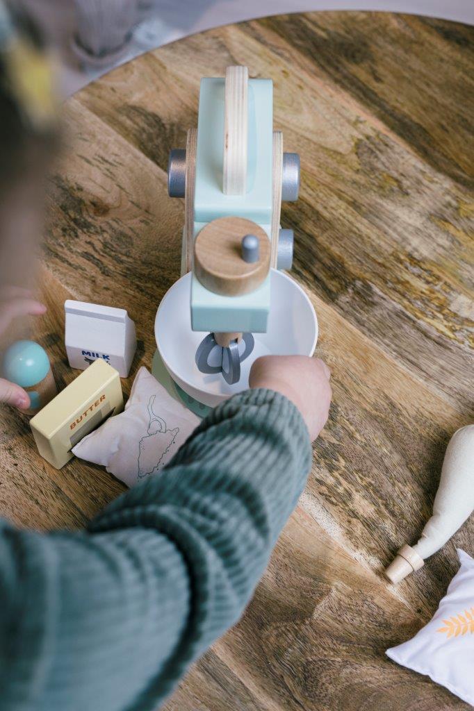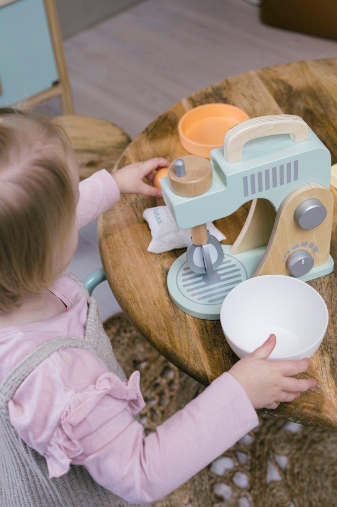 Ten pastelowy mikser kuchenny z miską i akcesoriami do pieczenia jest idealny dla dzieci, aby rozpocząć przygodę z gotowaniem, pieczeniem i ze wspaniałym światem urządzeń kuchennych. Coraz więcej i bardzo różnych urządzeń znajduje się w kuchni i dlatego świat fantazji dziecięcej musi być na bieżąco. Piękny i nowoczesny wygląd miksera pomaga wyobraźni, a zabawka pozwala dziecku wykonywać dokładnie te same czynności, co rodzice. Pokrętła do trzepaczki i włącznik miksera sprawiają, że zabawka wygląda jak prawdziwe uprzędzenie kuchenne, a ruchome ramię zapewnia wiele opcji kreatywnej zabawy. Do tego mamy zabawowe produkty do pieczenia ciasta: mleko, masło, mąkę, jajko cukier, wyciskarkę do kremów i łyżkę.