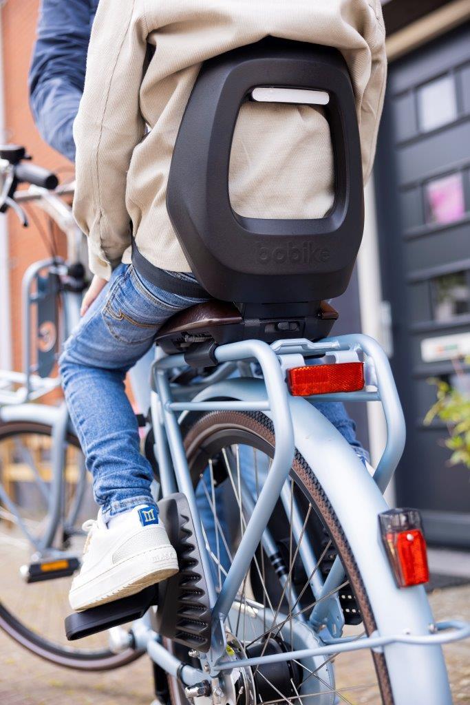 Bobike One Junior można łatwo zamontować do bagażnika roweru. Mocowanie pasuje do bagażników o szerokości 120 - 175 mm (4,72 - 6,89"), które mogą przewozić do 38 kg. Rury zewnętrzne muszą być okrągłe i mieć średnicę między 10 - 16 mm. Odpowiedni dla rowerów elektrycznych do max. 25 km/h.