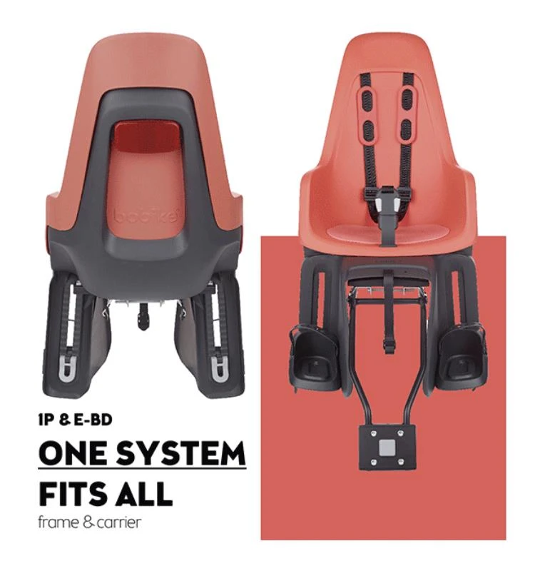 Bobike ONE Maxi to fotelik rowerowy, który można zamontować z tyłu roweru i który jest odpowiedni dla dzieci w wieku od około 9 miesięcy do 6 lat lub o wadze ciała 22 kg. Fotelik ONE maxi 1P & E-BD jest dostarczany z bazą na bagażnik Click & Go w połączeniu z uchwytem na ramę 1P. Ten typ mocowania jest odpowiedni dla rowerów bez bagażnika lub dla rowerów z bagażnikiem, który nie jest zgodny z normą bezpieczeństwa EN 1487.