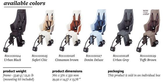 Fotelik jest montowany do ramy roweru, wyposażony jest w nowy system montażu stelaża/uchwyt 1P, który eliminuje konieczność montowania bazy/ramki do niego, ponieważ system montażu jest już zintegrowany z siedziskiem. Dzięki temu siedzisko jest lżejsze i łatwiejsze do zamontowania. Uchwyt pasuje do okrągłych i owalnych ram i jest specjalnie zaprojektowany tak, aby pomieścić linkę hamulca i uniknąć jej przyciśnięcia. System ten pasuje do rowerów z bagażnikiem lub bez bagażnika.