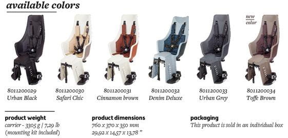 W zestawie znajduje się system łatwego montażu, czyli baza/ramka, która pozwala na szybki montaż do roweru jaki i umożliwia szybkie przełożenie fotelika między rowerami. System Easy, popularna baza/ramka montażowa może być montowana na bagażnikach zgodnych z normą ISO 11243 o szerokości od 120-175 mm i średnicy rury od 10 do 16 mm (tylko rury okrągłe) i została specjalnie zaprojektowana do montażu zarówno na rowerach elektrycznych, jak i zwykłych. Wszystkie modele dostępne są w sześciu stylowych kombinacjach kolorystycznych.