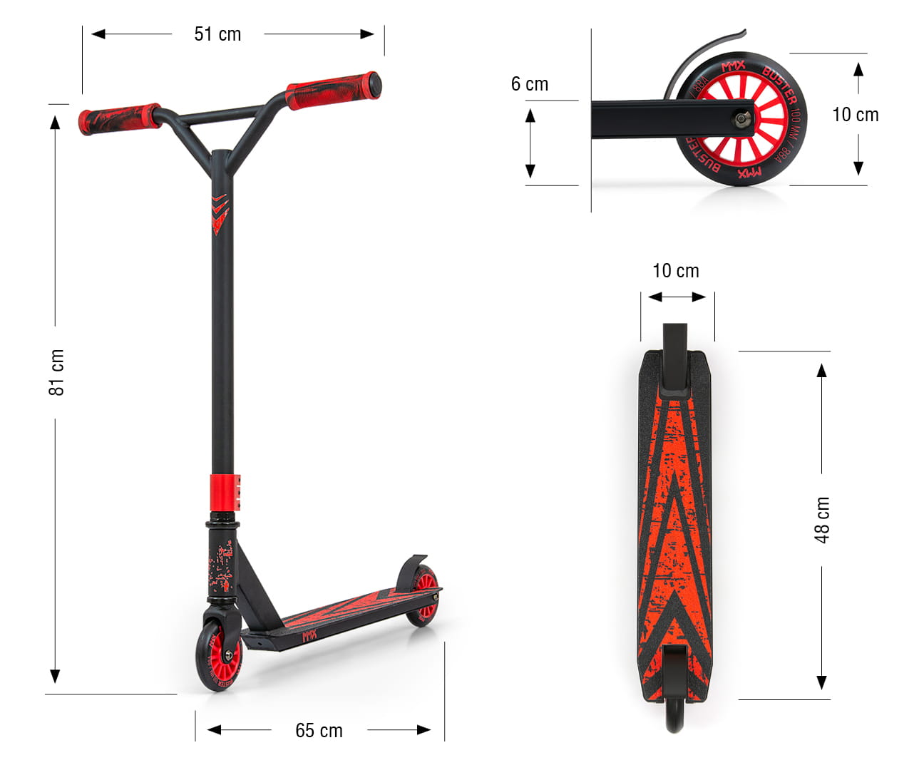 *ze względu na wyższe modele występujące w ofercie marki MMX producent zaleca hulajnogę BUSTER dla młodszych i mniej zaawansowanych użytkowników o wadze do 80kg – którzy dopiero zaczynają przygodę z hulajnogami wyczynowymi. Hulajnoga została przetestowana jak wszystkie hulajnogi klasy A wg normy EN 14619 – dla wagi do 100kg. Dopuszczalna maksymalna waga 100kg.
