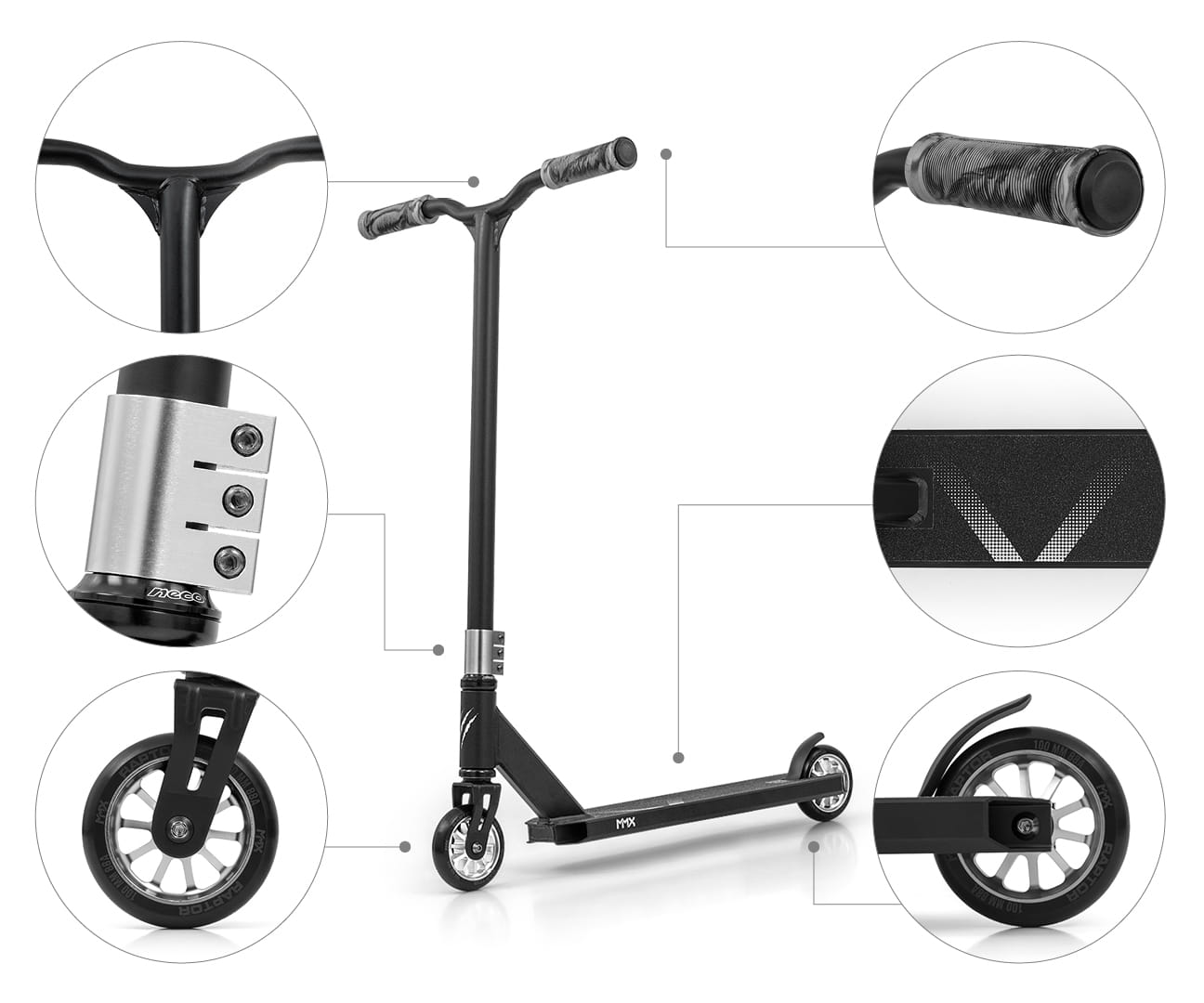 Hulajnogi wyczynowe MMX stworzone z najwyższej jakości materiałów – dla zapewnienia najwyższego poziomu bezpieczeństwa podczas jazdy freestylowej.