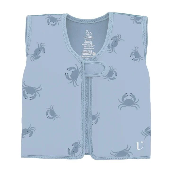 Neoprenowa kamizelka wypornościowa do pływania marki Vanilla Copenhagen dla dzieci w błękitnym kolorze w urocze kraby sprawdzi się idealnie podczas nauki pływania i zabawy, aby maluchy w kamizelce mogły pływać jak rybki w wodzie. Kamizelka zwiększa komfort i bezpieczeństwo dziecka w basenach, w parkach wodnych, nam morzem i są to podstawowe cele i elementy kolekcji kąpielowej Vanilla Copenhagen. Kamizelka posiada osiem wewnętrznych pływaków. Zapewniają one pływalność dostosowaną do rozmiaru, potrzeb i umiejętności pływackich dziecka. Wyporność można regulować, wyjmując pływaki z kieszeni wewnątrz kamizelki. Gdy dziecko znajdzie się na odpowiednim poziomie, będzie mogło z łatwością kontrolować swoją pływalność.