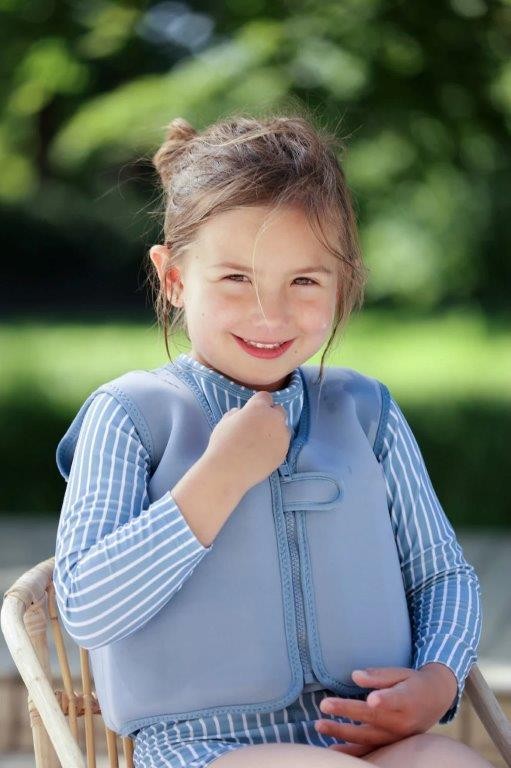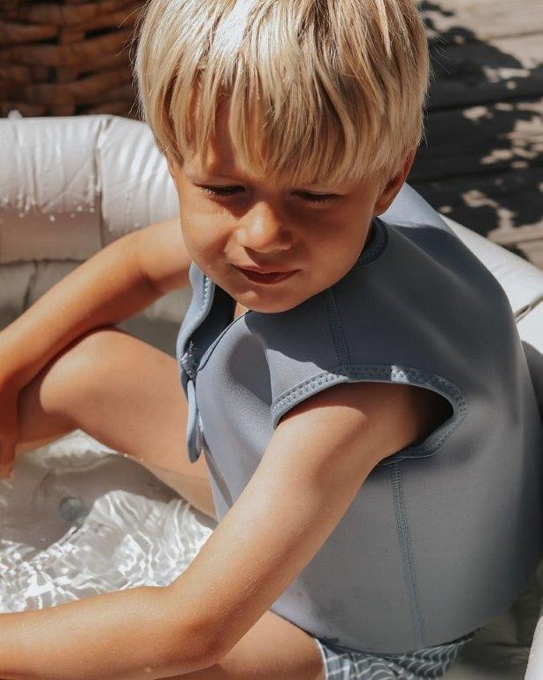 Kamizelka jest wykonana z miękkiego neoprenu 2 mm, z wytrzymałą warstwą nylonu po bokach, mocnymi szwami i mocnym zamkiem YKK oraz z zapięciem na rzep, aby dziecko nie mogło jej otworzyć. Kamizelka neoprenowa zwiększa komfort i bezpieczeństwo w wodzie oraz chroni przed słońcem (SPF 50+)