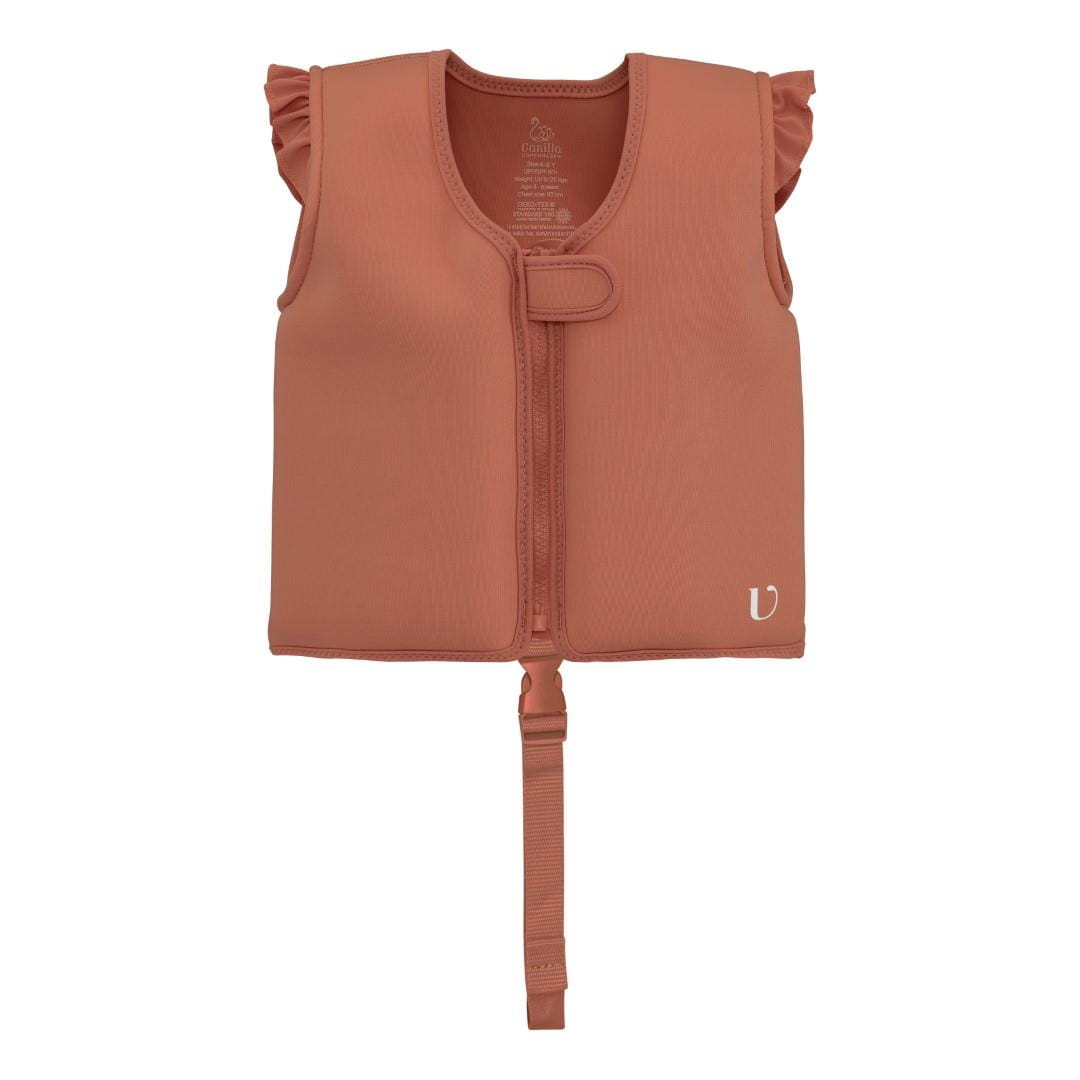 Neoprenowa kamizelka wypornościowa do pływania marki Vanilla Copenhagen w uroczym koralowym kolorze, z delikatną falbanką na ramionach, z regulowanym paskiem dla najmłodszych sprawdzi się idealnie podczas nauki pływania i zabawy, a maluchy w kamizelce będą pływać jak małe rybki w wodzie.