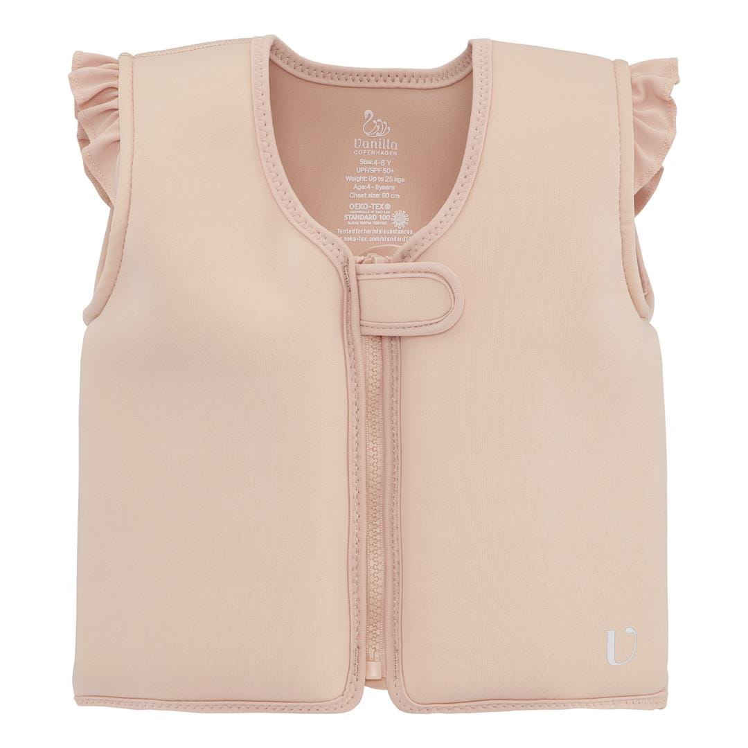 Neoprenowa kamizelka wypornościowa do pływania marki Vanilla Copenhagen dla dzieci w kolorze angielskiego różu, z delikatną falbanką na ramionach sprawdzi się idealnie podczas nauki pływania i zabawy, aby maluchy w kamizelce mogły pływać jak rybki w wodzie. Kamizelka zwiększa komfort i bezpieczeństwo dziecka w basenach, w parkach wodnych, nam morzem i są to podstawowe cele i elementy kolekcji kąpielowej Vanilla Copenhagen. Kamizelka posiada osiem wewnętrznych pływaków. Zapewniają one pływalność dostosowaną do rozmiaru, potrzeb i umiejętności pływackich dziecka. Wyporność można regulować, wyjmując pływaki z kieszeni wewnątrz kamizelki. Gdy dziecko znajdzie się na odpowiednim poziomie, będzie mogło z łatwością kontrolować swoją pływalność.