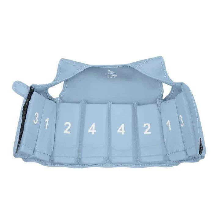 Kamizelka posiada osiem wewnętrznych pływaków. Zapewniają one pływalność dostosowaną do rozmiaru, potrzeb i umiejętności pływackich dziecka. Wyporność można regulować, wyjmując pływaki z kieszeni wewnątrz kamizelki. Gdy dziecko znajdzie się na odpowiednim poziomie, będzie mogło z łatwością kontrolować swoją pływalność.