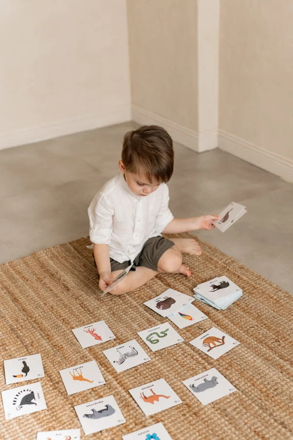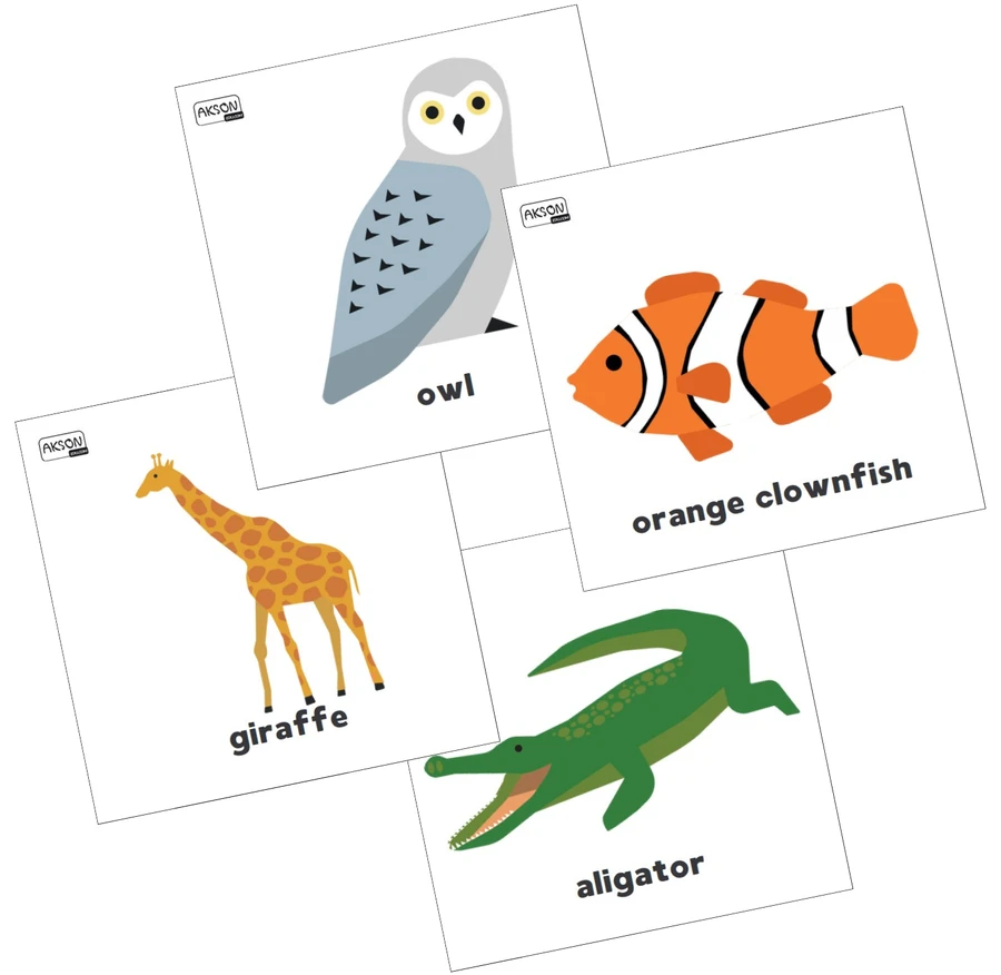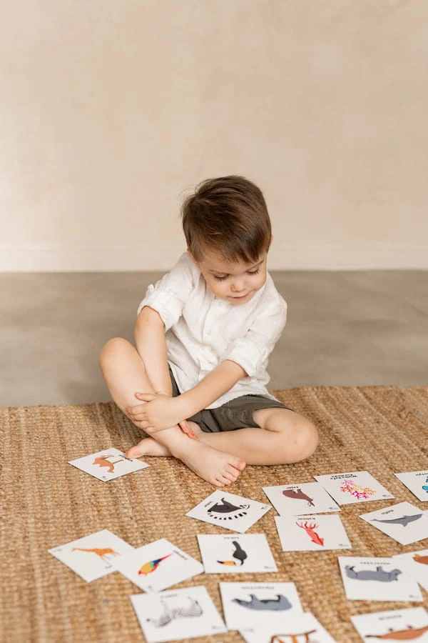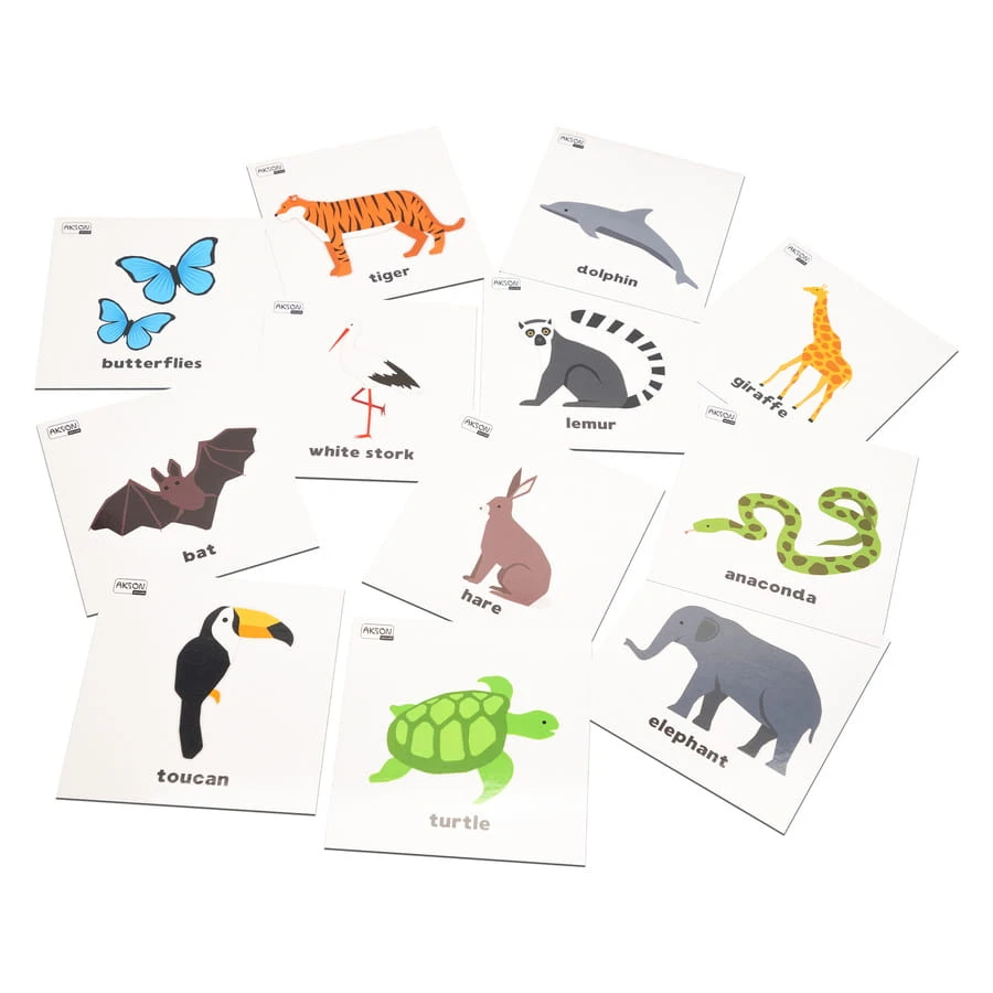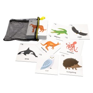 Zestaw zawiera 78 kart. Na kartach znajdziesz kolorowe zwierzęta z całego świata, wraz z ich nazwami po angielsku.