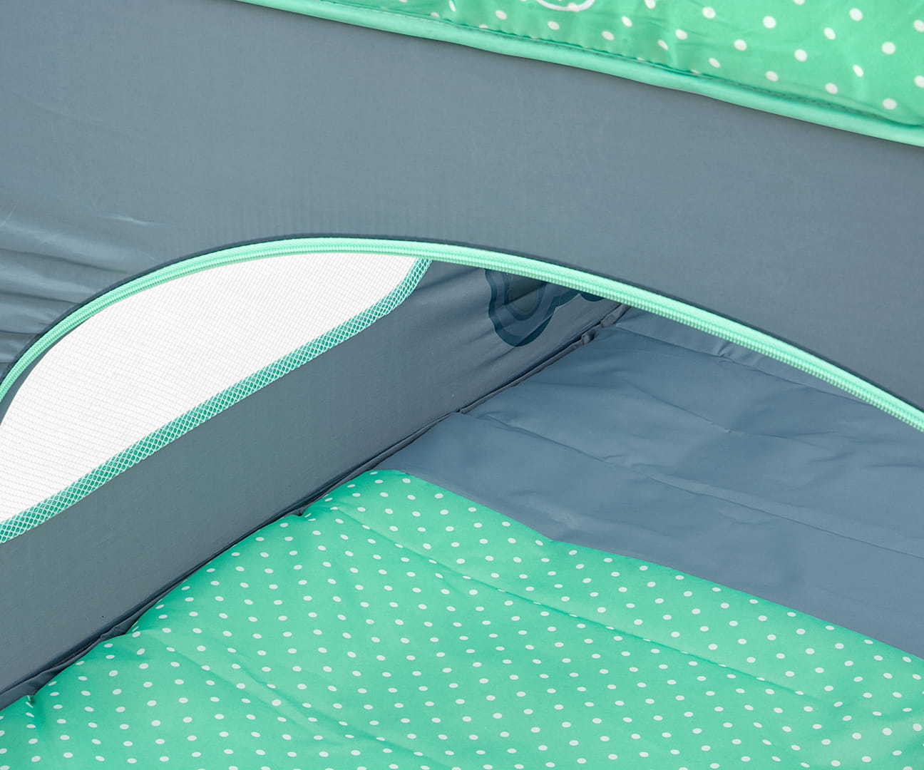 Boki łóżeczka zostały wykonane z mocnej siateczki, która zapewnia odpowiednią cyrkulację powietrza. Ponadto wpływają pozytywnie na poczucie bezpieczeństwa, dziecko podczas zabawy widzi rodziców – zatem spokojnie się bawi, jednocześnie będąc pod nadzorem rodzica.