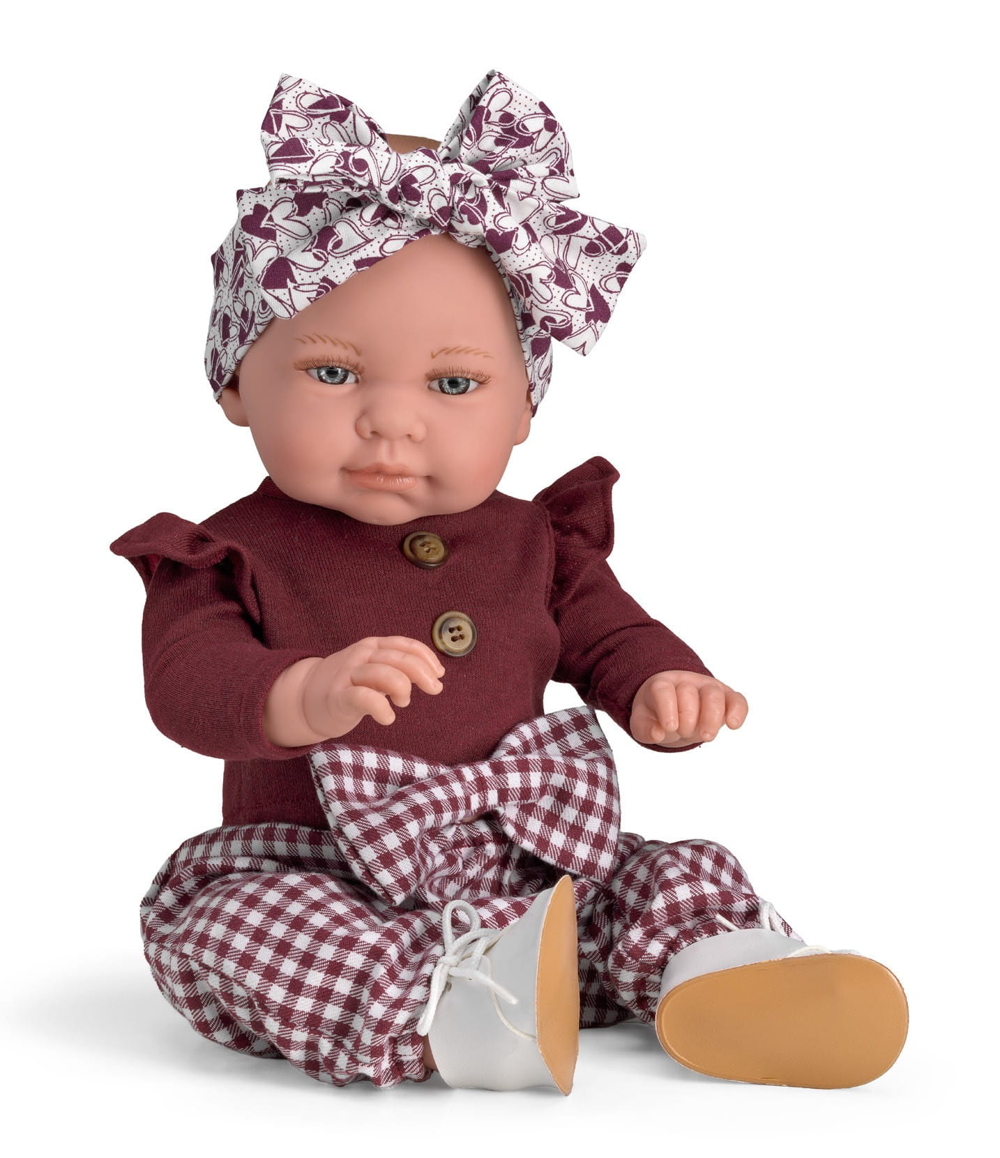 Elegancki i niepowtarzalny styl outfitu z całą pewnością wyróżnia śliczną lalkę hiszpańską z kolekcji Magic Baby Dolls. Marina ubrana jest w oryginalnie zaprojektowane, wysokiej jakości ręcznie szyte ubranka. Bordowa bluzeczka z falbankami przy ramionach oraz guziczkami ozdobnymi wspaniale komponuje się ze spodenkami w ponadczasową kratkę. Białe wiązane buciki, wykonane z miękkiej skóry, idealnie dopełniają całość.