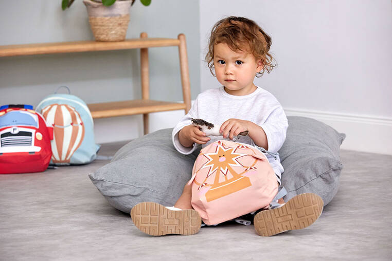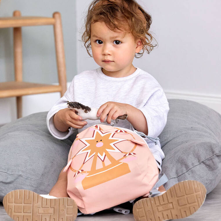 Uroczy plecaczek z Diabelskim młynem niemieckiej marki LASSIG. Funkcjonalny, lekki i wygodny, idealny dla maluchów już od 2. roku życia, do przedszkola i na krótkie wycieczki. Ma jasnoróżowy kolor, a na froncie aplikację sympatycznego diabelskiego młyna w kolorze karmelowym z różowymi i biało-bordowymi elementami. Niektóre elementy młyna są 3D – wypukłe (dwa boczne wagoniki), co przyciąga uwagę i zawsze podoba się dzieciom. Komora główna zapinana jest na suwak, posiada wewnętrzną kieszeń na butelkę z napojem oraz etykietkę z wizytówką, na której można zapisać imię dziecka i numer kontaktowy rodzica. Plecak uszyto z wysokiej jakości, trwałych materiałów, tylna ścianka jest lekko wzmocniona, ale nadal miękka w kontakcie z plecami dziecka. W górnej części znajduje się uszko do zawieszenia plecaka, np. na haczyku w szatni. Dość szerokie, grubsze i miękkie ramiączka zapewniają wygodę noszenia. Z przodu, na klatce piersiowej dodatkowo wyposażone są w stabilizujące i odciążające plecy zapięcie na zatrzask – jego wysokość, podobnie jak długość ramiączek, można regulować i na bieżąco dopasowywać do wzrostu dziecka. Uszko, paski oraz ułatwiające dziecku samodzielne zapinanie sznureczki przy suwaku mają kolor bladoniebieski, suwak, zatrzaski i elementy regulacji są białe. Materiał plecaka łatwo się czyści i jest odporny na wilgoć.