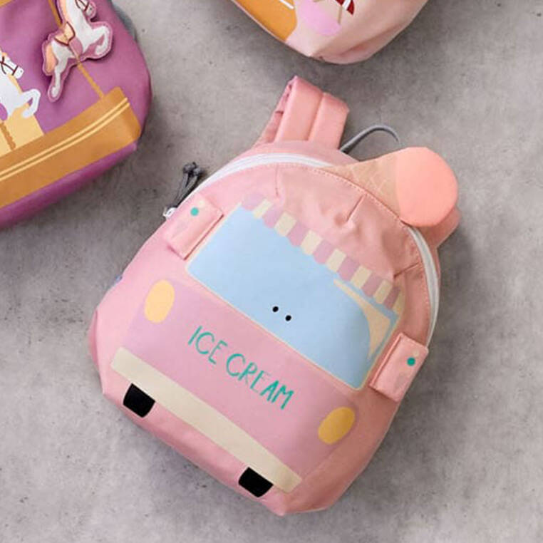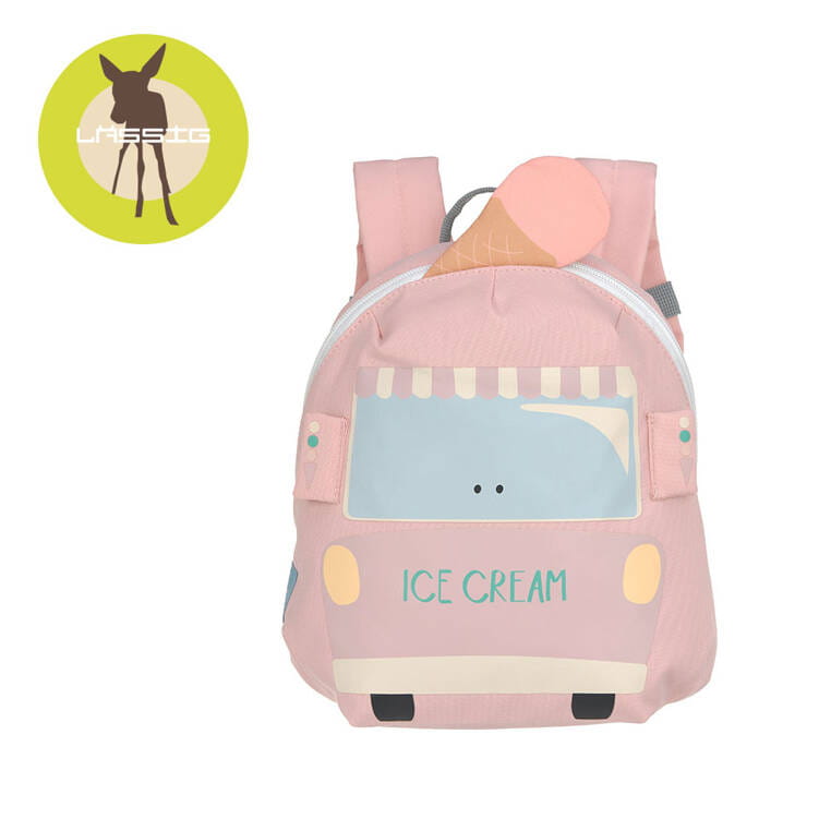 Uroczy plecaczek z Samochodem z lodami niemieckiej marki LASSIG. Funkcjonalny, lekki i wygodny, idealny dla maluchów już od 2. roku życia, do przedszkola i na krótkie wycieczki. Ma jasnoróżowy kolor i aplikację sympatycznego wozu z lodami na froncie. Niektóre elementy pojazdu są 3D – wypukłe (lodowy rożek na dachu, boczne lusterka), co przyciąga uwagę i zawsze podoba się dzieciom. Komora główna zapinana jest na suwak, posiada wewnętrzną kieszeń na butelkę z napojem oraz etykietkę z wizytówką, na której można zapisać imię dziecka i numer kontaktowy rodzica. Plecak uszyto z wysokiej jakości, trwałych materiałów, tylna ścianka jest lekko wzmocniona, ale nadal miękka w kontakcie z plecami dziecka. W górnej części znajduje się uszko do zawieszenia plecaka, np. na haczyku w szatni. Dość szerokie, grubsze i miękkie ramiączka zapewniają wygodę noszenia. Z przodu, na klatce piersiowej dodatkowo wyposażone są w stabilizujące i odciążające plecy zapięcie na zatrzask – jego wysokość, podobnie jak długość ramiączek, można regulować i na bieżąco dopasowywać do wzrostu dziecka. Uszko, paski oraz ułatwiające dziecku samodzielne zapinanie sznureczki przy suwaku mają kolor bladoniebieski, suwak, zatrzaski i elementy regulacji są białe. Materiał plecaka łatwo się czyści i jest odporny na wilgoć.