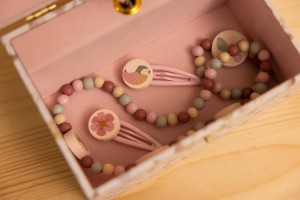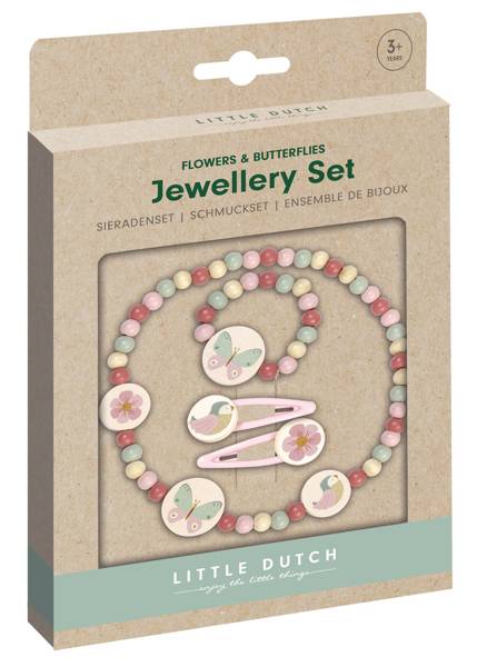 Zestaw biżuterii Little Dutch Flowers & Butterflies. W zestawie znajdziecie naszyjnik, dwie spinki i bransoletkę, całość utrzymana w uroczej, pastelowej kolorystyce z dodatkami w motywie z kolekcji Flowers & Butterflies. Zestaw wykonany jest z drewna. Będzie stanowić idealne uzupełnienie do Szkatułki z pozytywką Rosa. Świetny pomysł na prezent dla każdej małej elegantki.