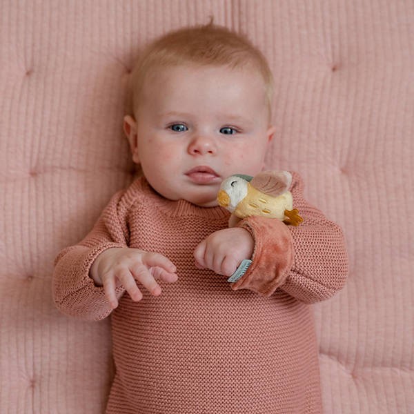 Bransoletka grzechotka od Little Dutch z kolekcji Flowers & Butterflies. Ta miękka bransoletka z grzechotką zachwyci Twojego maluszka, wystarczy, że zapniesz ją na nadgarstku. Każdy ruch rączką będzie powodował przyjemny dźwięk, który z pewnością zainteresuje dziecko. Ta bransoletka z grzechotką to świetny pomysł na prezent dla ciekawskich niemowląt, jest pełna niespodzianek. Poza uroczym ptaszkiem, który grzechocze, bransoletka grzechotka ma jeszcze metki i węzełki zachęcające dziecko do chwytania za nie i bawienia się nimi. Cudowna zabawka dla szczęśliwego maluszka. Bransoletka jest lekka i może być pierwszą i ulubioną zabawką Twojego maleństwa. Radosny pluszowy ptaszek pozwala dziecku ćwiczyć koordynację ręka-oko i pobudza jego ciekawość. Pozwoli również przynieść ulgę w okresie ząbkowania.