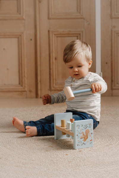 Drewniana przebijanka Forest Friends FSC od Little Dutch. Zabawa polega na uderzaniu w kołki przebijając je na dół. W skład przebijanki wchodzi 6 kołków w różnych kolorach, drewniana ławeczka i młotek. To bardzo dobre ćwiczenie poprawiające zdolności motoryczne dzieci. W chwili przebicia wszystkich kołków, można odwrócić zabawkę i rozpocząć zabawę od nowa. Przebijanka jest świetnym pomysłem na prezent i doskonale uzupełnienia pozostałe zabawki z kolekcji Forest Friends od Little Dutch.