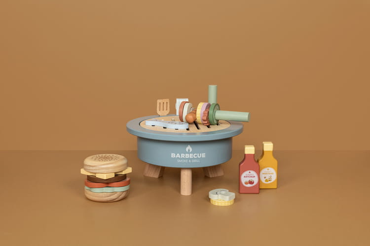 Zestaw Grill FSC od Little Dutch. Co grillujesz, mały szefie kuchni? Dzięki temu zabawkowemu zestawowi do grillowania masz pod ręką wszystkie narzędzia, które pozwolą Ci naśladować radość prawdziwego grillowania. W zestawie szczypce i szpatułka oraz dwa patyczki do szaszłyków. Podnieś ruszt grilla i wypełnij go kawałkami węgla drzewnego, aby rozgrzać grill. Stwórz własny mix warzyw i mięsa, aby stworzyć smaczny szaszłyk dla swoich ulubionych zabawek, mamy i taty lub rodzeństwa. Wykaż się kreatywnością i zbuduj pysznego drewnianego hamburgera z bułką.