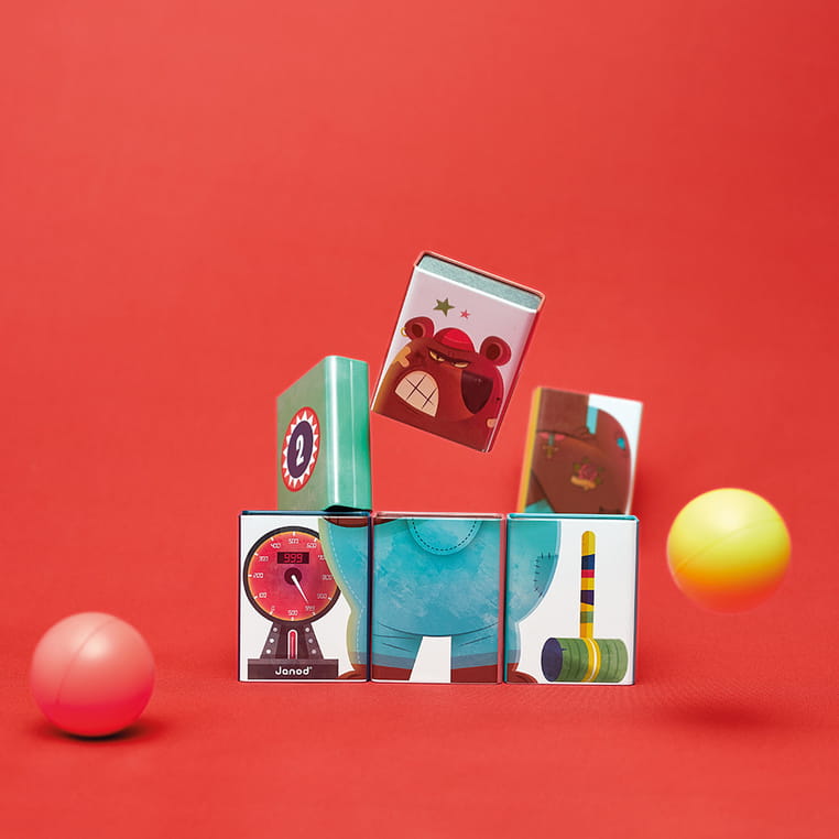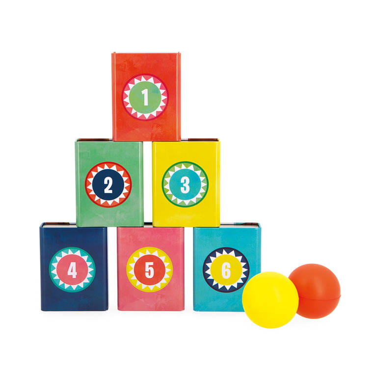 Gra w zbijanie puszek Niedźwiedź z kolekcji Applepop francuskiej marki JANOD to wspaniała zabawa zarówno dla dzieci, jak i rodziców. W skład zestawu wchodzą 2 piankowe piłeczki oraz 6 metalowych prostokątnych puszek, które – ułożone jedna na drugiej w odpowiedniej kolejności – tworzą obrazek niedźwiedzia-siłacza. Na innym boku każda z nich ma numer od 1 do 6. Celem gry jest przewrócenie, czyli zbicie wszystkich puszek poprzez rzucanie w nie piłką. Gracz, który zrobi to jako pierwszy – wygrywa. Gra ta uczy wspiera rozwój koordynacji ręka-oko, trenuje cierpliwość i skupienie. Jest idealna do zabaw plenerowych, np. na pikniki czy urodzinowe przyjęcia.