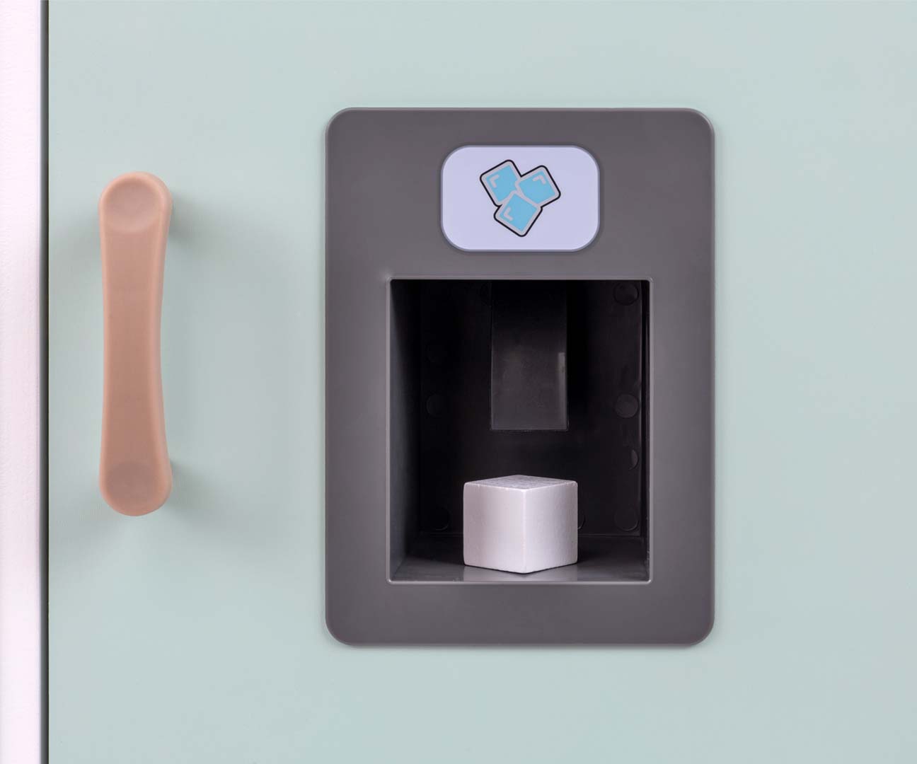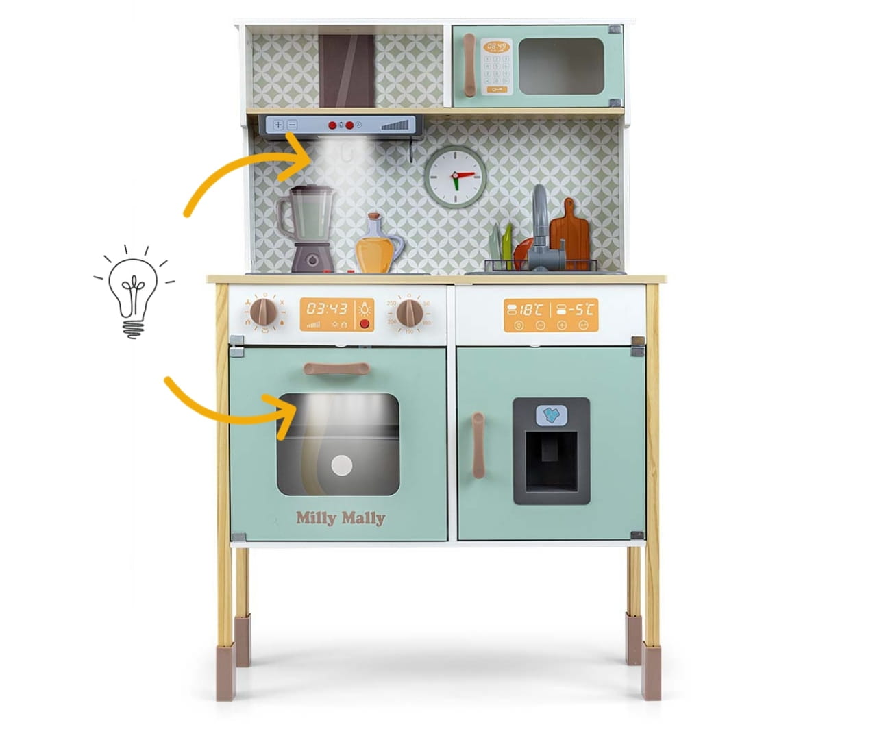 Drewniana kuchnia marki Milly Mally Bjorn- mint posiada piekarnik z: uchylanymi drzwiami i okienkiem z pleksi, „blachę”, 2 klikające pokrętła i czerwony przycisk włączający światło. Obok piekarnika jest mała lodówka z realistyczną kostkarką do lodu. W otwieranych drzwiach umieszczony jest przeźroczysty kubek z 3 kostkami lodu.