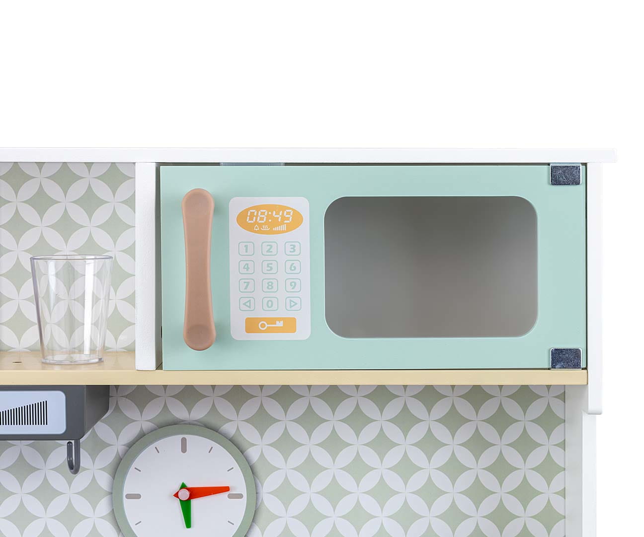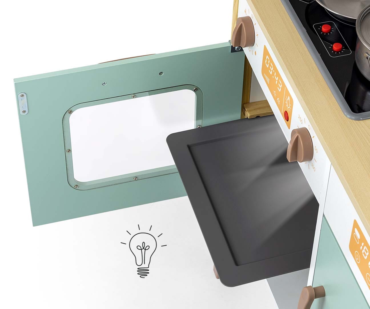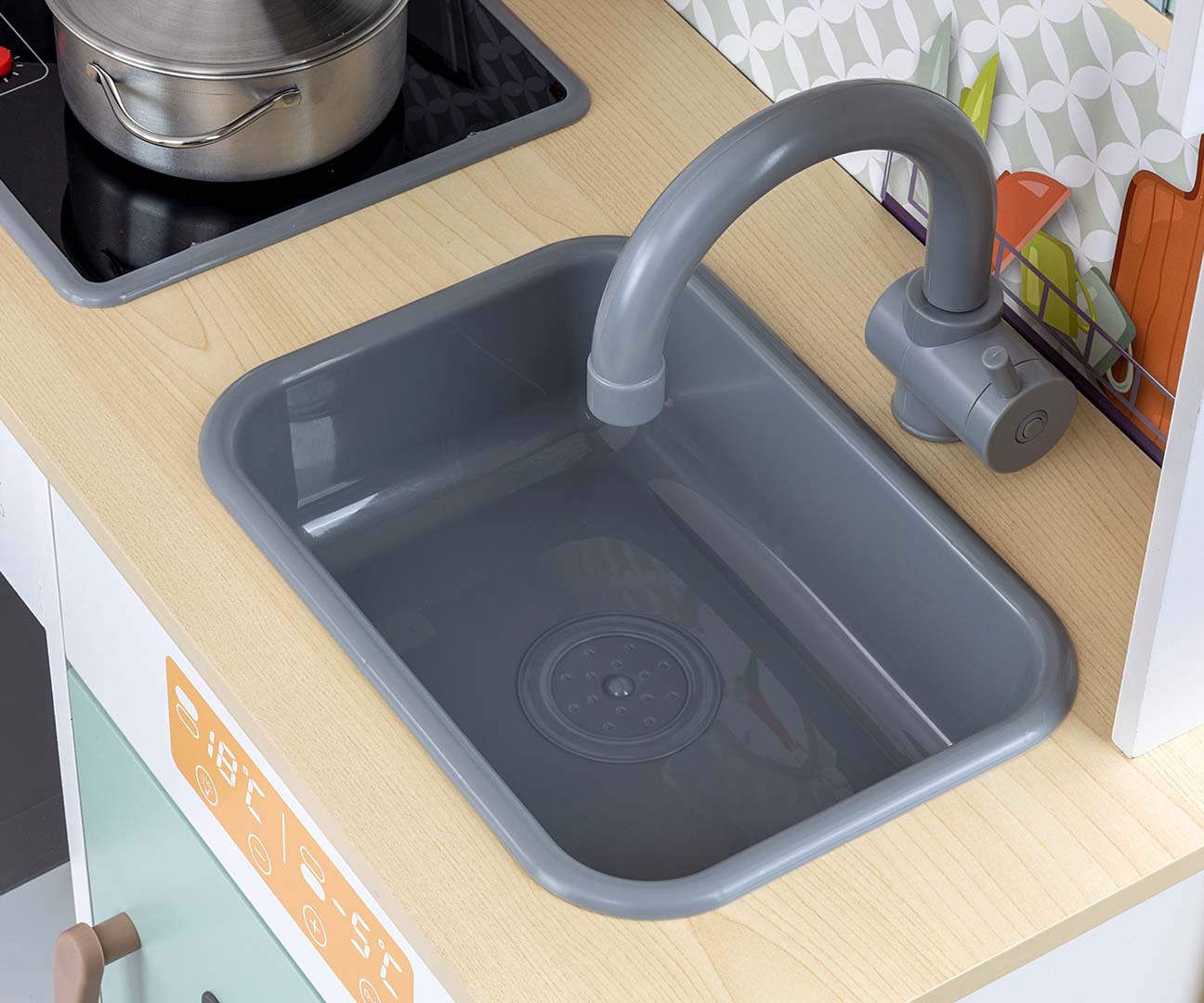 Na blacie umieszczona została elektryczna płyta kuchenna z dwoma polami grzejnymi i przyciskami uruchamiającymi dźwięk gotującej się wody oraz podświetlenie palników. Jest też, jednokomorowy szary zlew z kranem. Natomiast, okap kuchenny posiada; dwa przyciski uruchamiające dźwięk wyciągu lub światło i 2 przesuwane haczyki a zawieszony obok zegar ma ruchome wskazówki. Na ściance zostały namalowane: po lewej- blender i szklany flakonik z olejem, po prawej- atrapa suszarki do naczyń, a na niej deska do krojenia, talerze i kubki. Nad zlewem umieszczona została mikrofalówka z otwieranymi drzwiami i okienkiem z przeźroczystej pleksi, żeby mały kucharz widział produkty w niej umieszczone.