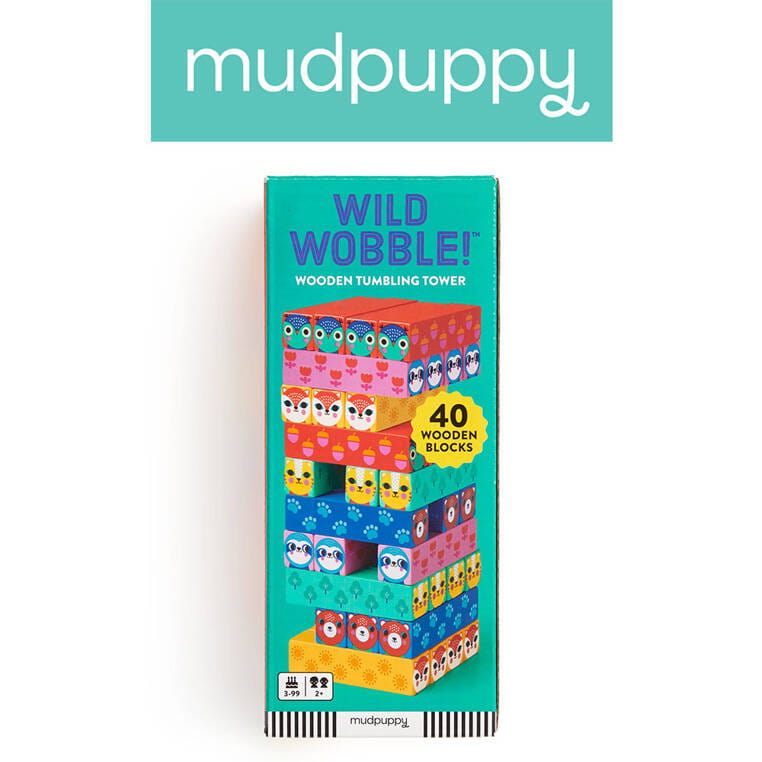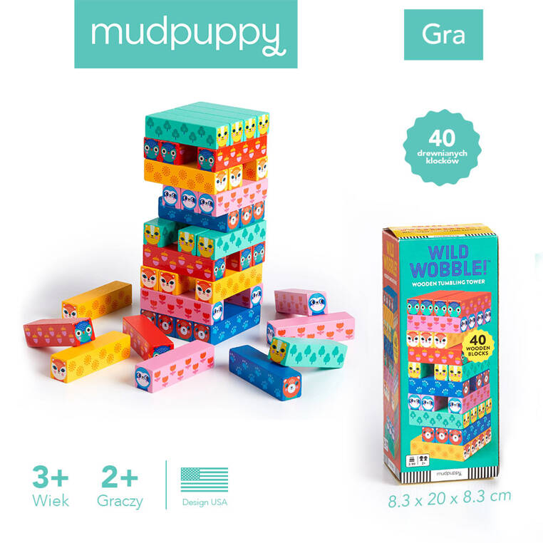 Drewniana gra zręcznościowa Chwiejna wieża! amerykańskiej marki MUDPUPPY to wspaniała zabawa dla dwóch lub więcej graczy. Zestaw składa się z 40 podłużnych drewnianych klocków w różnych kolorach i z buźkami różnych zwierząt na brzegach. Z ułożonej na wstępie wieży (po 4 klocki na każdym jej poziomie) należy wyjmować po jednym bloczku i układać go na górze konstrukcji w taki sposób, by z niej nie spadł i by jej nie zniszczyć. Gracze robią to kolejno w swoich rundach, a ten, który doprowadzi do upadku wieży – przegrywa. Zabawa ćwiczy koncentrację, zręczność i cierpliwość, a przy okazji trenuje koordynację ręka-oko. Do gry dołączona jest instrukcja (także w języku polskim). Zabawka zapakowana jest w estetyczne kartonowe pudełko. Idealnie nadaje się na prezent.