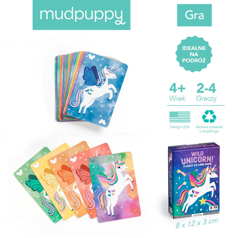 Gra karciana Wild Unicorn! amerykańskiej marki MUDPUPPY to wyjątkowa odmiana klasycznej gry karcianej w Makao. Składa się z talii kart z pięknymi jednorożcami z różnymi motywami/wzorami na ciele na różnokolorowych tłach. Gra polega na porównaniu swoich kart (kolory, obrazki) z kartą leżącą na środku. Jeżeli gracz posiada pasującą kartę - oddaje ją, natomiast jeżeli jej nie ma to pobiera dodatkową. Wygrywa gracz, który pozbędzie się wszystkich swoich kart jako pierwszy. Ta gra to wspaniała zabawa zarówno dla dzieci, jak i dorosłych (może w niej brać udział od 2 do 4 osób). Uczy planowania, cierpliwości i skupienia, a przy okazji trenuje pamięć i spostrzegawczość. Do gry dołączona jest instrukcja (także w języku polskim). Karty zostały wykonane są z materiału w 90% pochodzącego z recyclingu, a nadruk to nietoksyczny tusz na bazie soi. Zapakowane są w estetyczne kartonowe pudełko, które łatwo zabrać w podróż. Idealnie nadają się na prezent.
