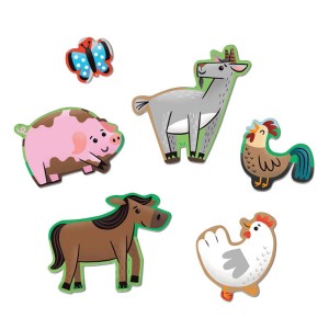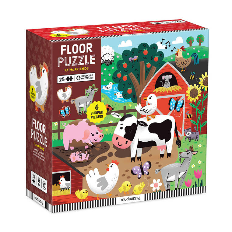 Zestaw puzzli podłogowych Farma amerykańskiej marki MUDPUPPY składa się z 25 bardzo dużych, łatwych do układania elementów, w tym 6 elementów specjalnych w unikatowych kształtach, a są to: ubłocona świnka, konik, kurka i kogucik, motyl i kozioł. Ułożony z nich sporych rozmiarów (56 x 56 cm) obrazek przedstawia zwyczajny dzień na farmie. Układankę można wykorzystywać do snucia opowieści o codzienności na wsi i do oswajania dziecka z codziennością, typową dla gospodarstw. Wyjątkowy pomysł, design i przyjazne barwy dodatkowo zachęcają do zabawy. Autorką ilustracji jest Emily Balsley – wszestronna artystka z Wisconsin. Puzzle wykonane są z materiału w 90% pochodzącego z recyclingu, a nadruk to nietoksyczny tusz na bazie soi. Zapakowane są w estetyczne kartonowe pudełko. Idealnie nadają się na prezent.