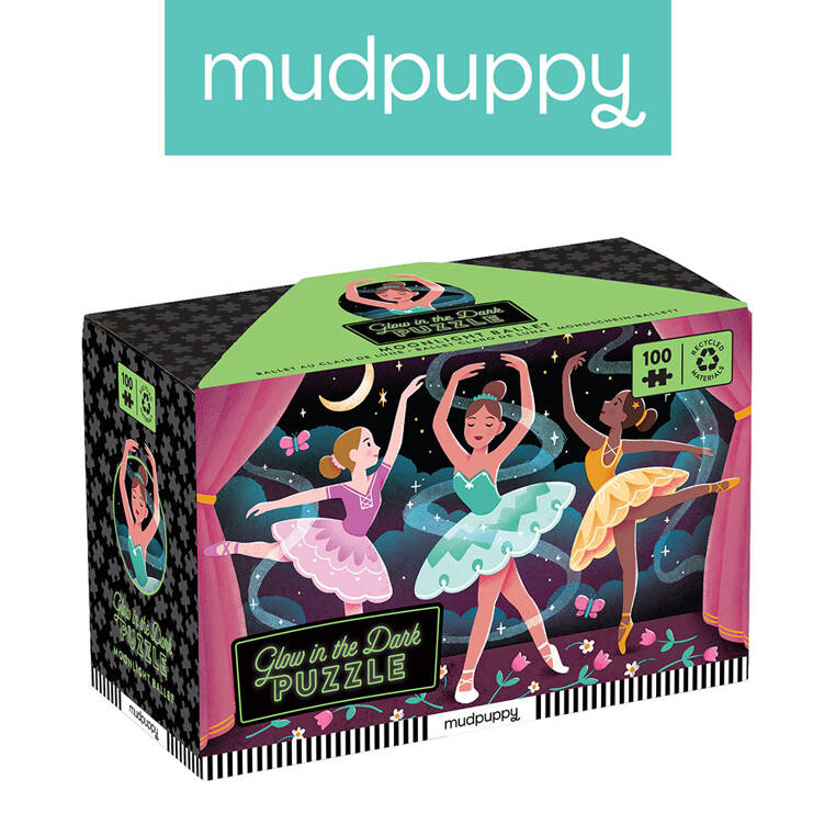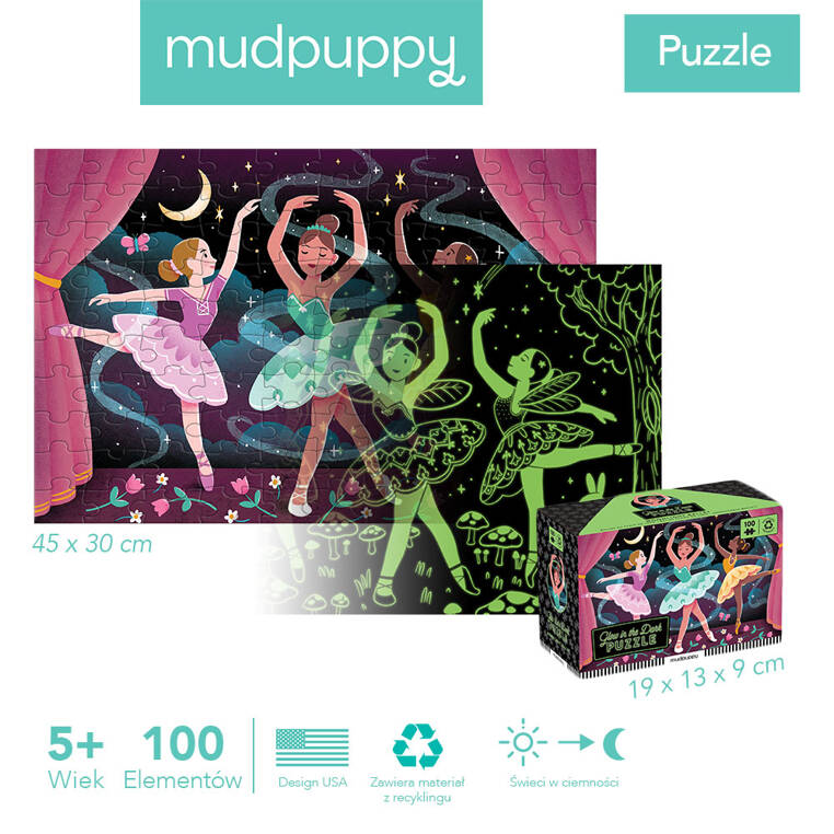Puzzle świecące w ciemności Balet w blasku księżyca amerykańskiej marki MUDPUPPY nadają układaniu puzzli nowy wymiar – na samym złożeniu obrazka zabawa się bowiem nie kończy. Układanka składa się z 100 elementów, które po ułożeniu tworzą obraz o wymiarach 45 x 30 cm. Przedstawiają trzy urocze baletnice, które tańczą w blasku księżyca. To jednak nie wszystko. Kiedy robi się ciemno zarówno te tancerki, jak i otaczający je krajobraz... świecą! Puzzle te to niebanalny pomysł na rodzinną rozrywkę. Zaciekawią i zachwycą wszystkich. Zapakowane są w estetyczne pudełko. Idealnie nadają się na prezent.