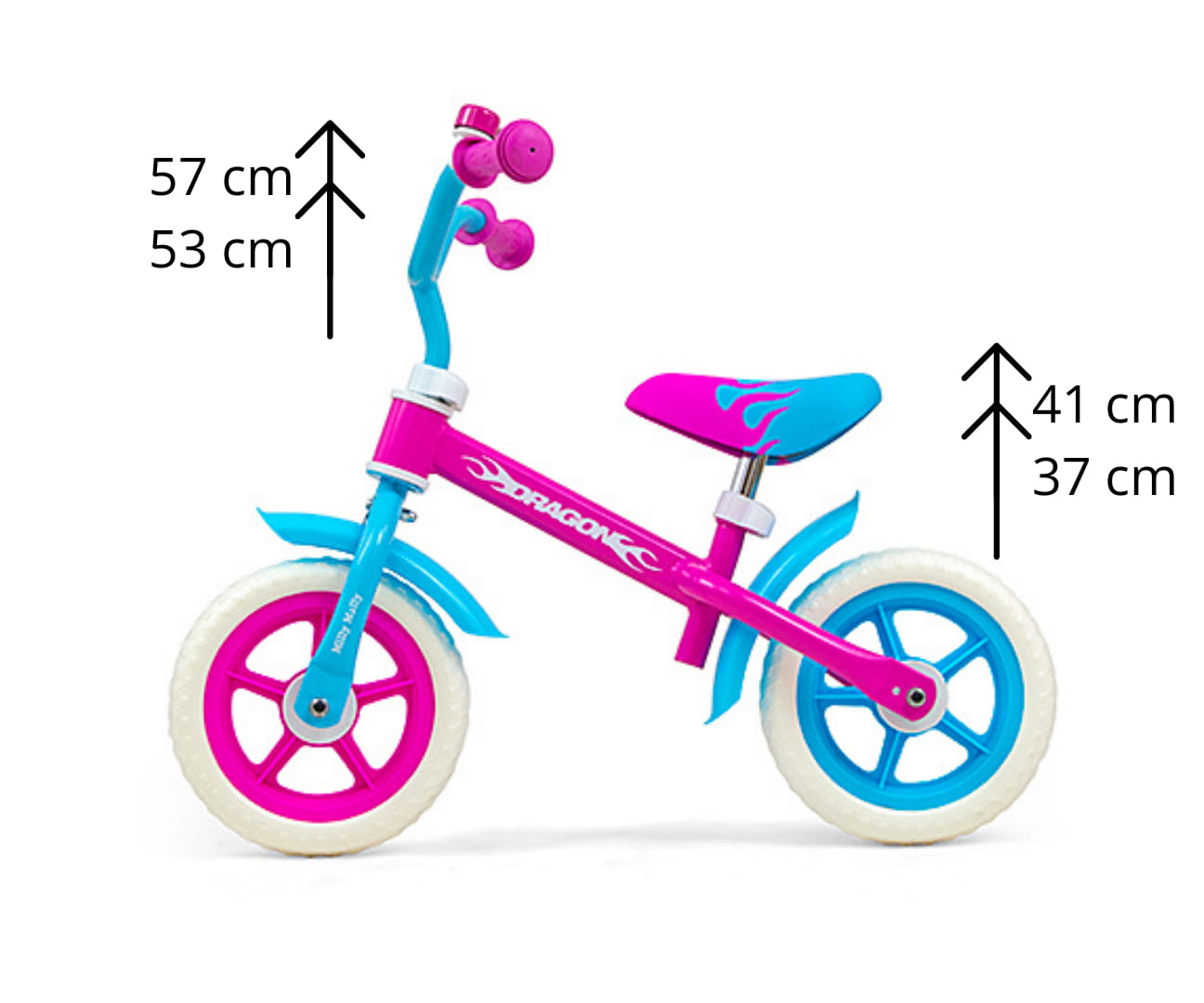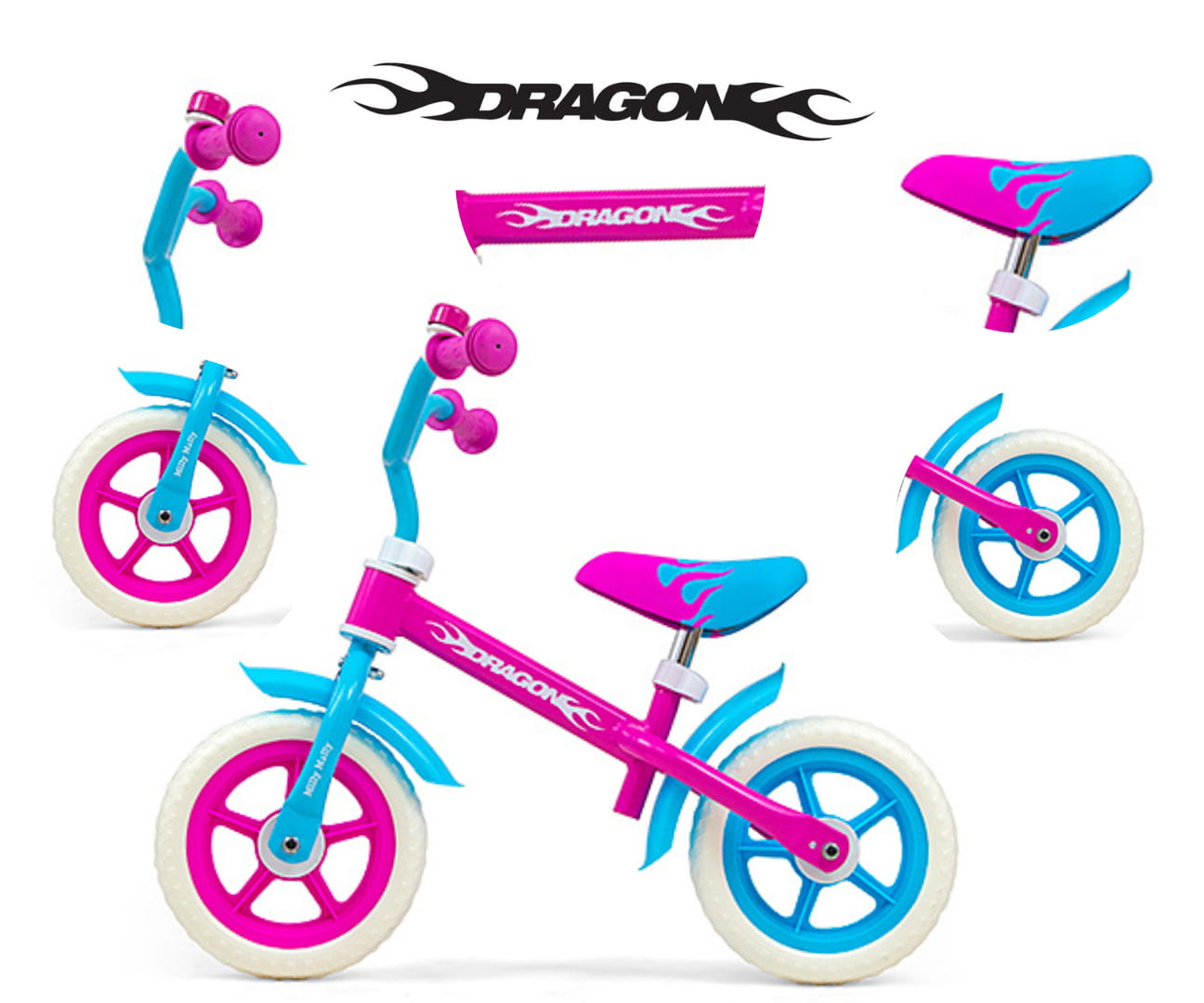 Rowerek biegowy DRAGON jest idealnym rozwiązaniem dla dzieci, które dopiero rozpoczynają naukę jazdy na rowerku biegowym. Rowerek ten pozbawiony jest pedałów, co pozwala skupić się dziecku na nauce utrzymywania równowagi i kierunku jazdy.