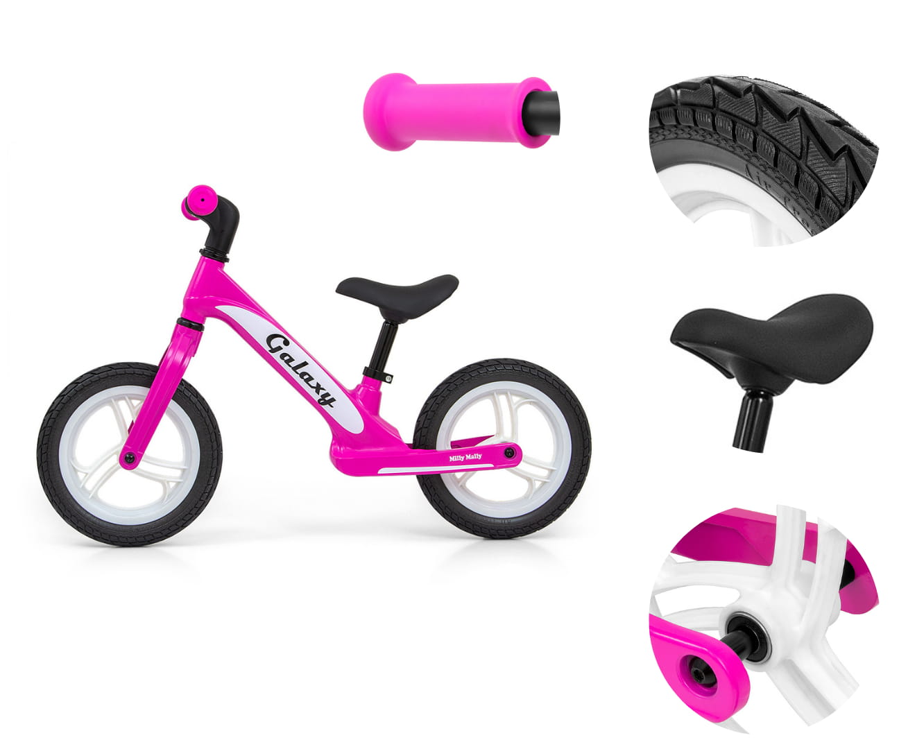Klasyczna i ergonomiczna konstrukcja rowerka zapewnia trwałość i wygodę użytkowania. Superlekka magnezowa rama rowerka zapewnia większą odporność na przeciążenia. Rowerek dostosowany do długotrwałej eksploatacji przez najmłodszych oraz wygodny w przenoszeniu dzięki niskiej wadze. Zastosowanie stopu magnezu w naszych rowerkach Galaxy docenił wcześniej m.in. przemysł lotniczy i motoryzacyjny, a od niedawna jest wykorzystywany do produkcji rowerów i rowerków biegowych. Właściwości magnezu to łatwiejsze kształtowanie w porównaniu np do stali czy aluminium. Stosowany dla zwiększenia komfortu i skuteczności użytkowania. Produkty zawierające ten pierwiastek dobrze tłumią drgania, niezwykle mało ważą i są odporne na „zmęczenie” sprawia, że rama działa jak naturalny amortyzator podczas jazdy.