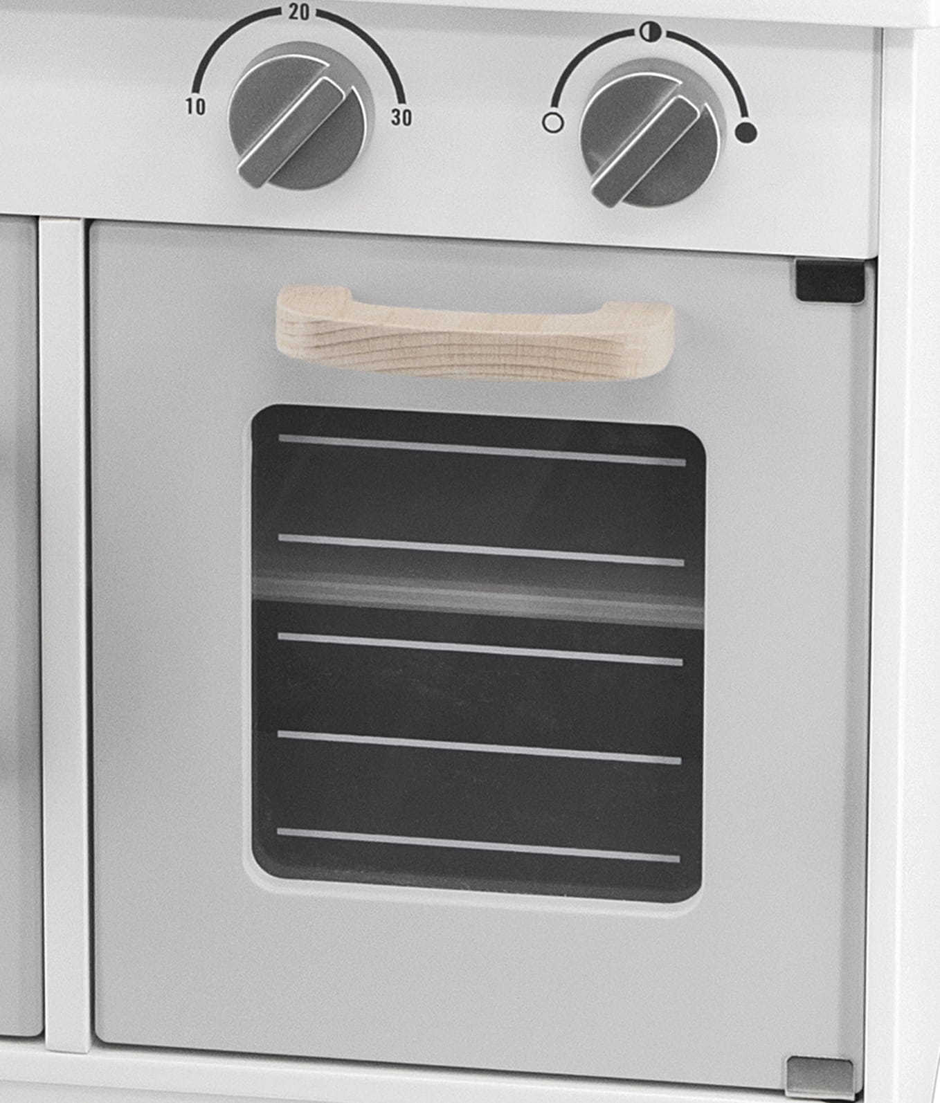 Ta zabawkowa kuchnia w modnym stylu jest wyposażona z pełen zestaw przyborów kuchennych. Kompletny zestaw zabawek kuchennych zawiera schowki i piekarnik na podstawie, dwie kuchenki i zlew, zegar na górze oraz akcesoria (w tym patelnię i jajko sadzone, rondel, łopatkę, łyżka i dwa słoiki z przyprawami.)