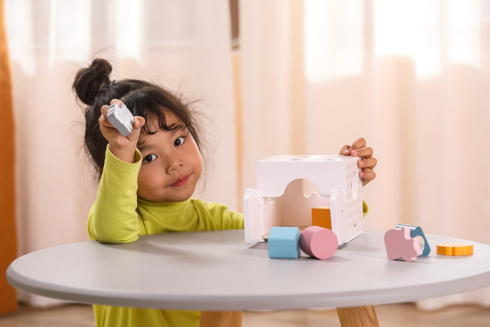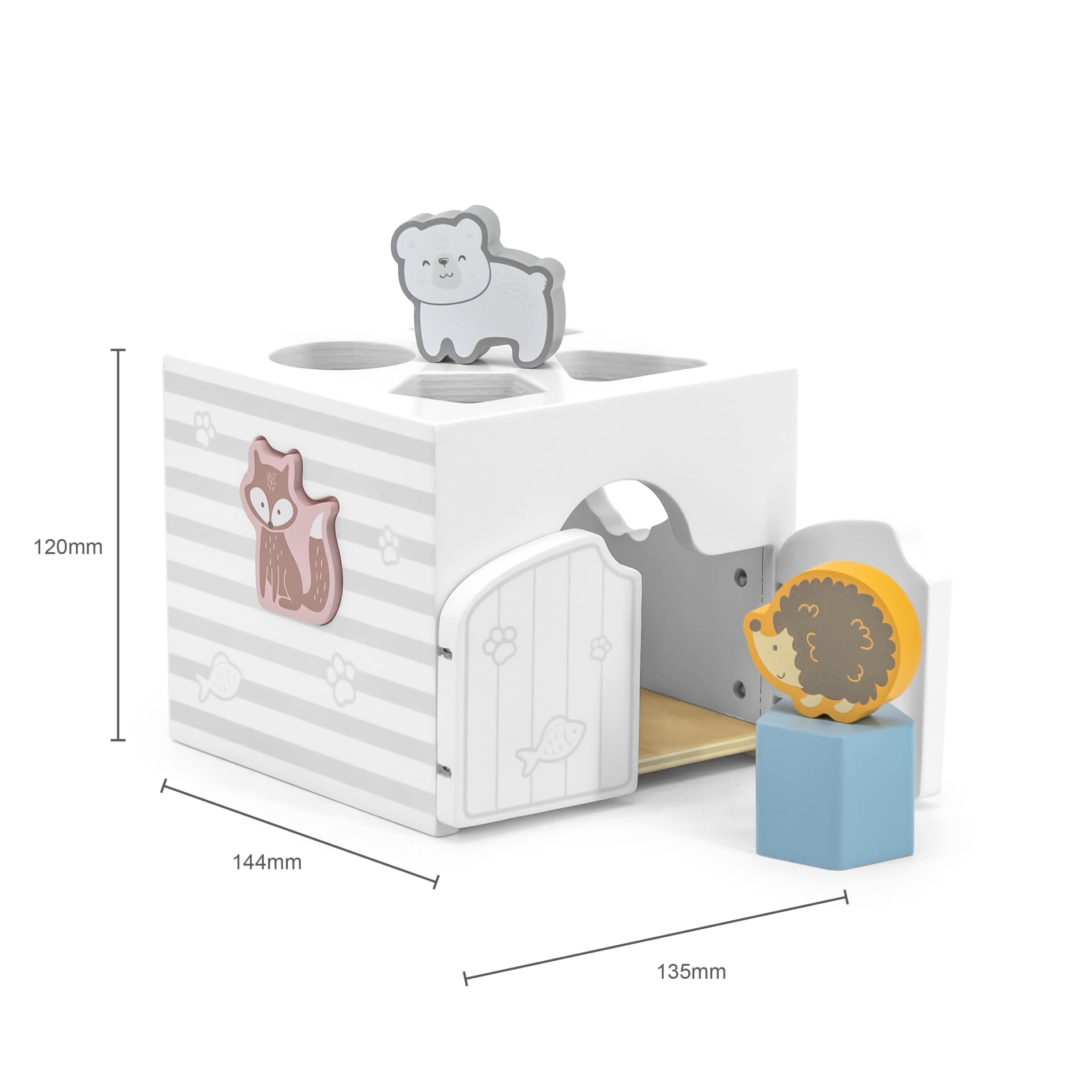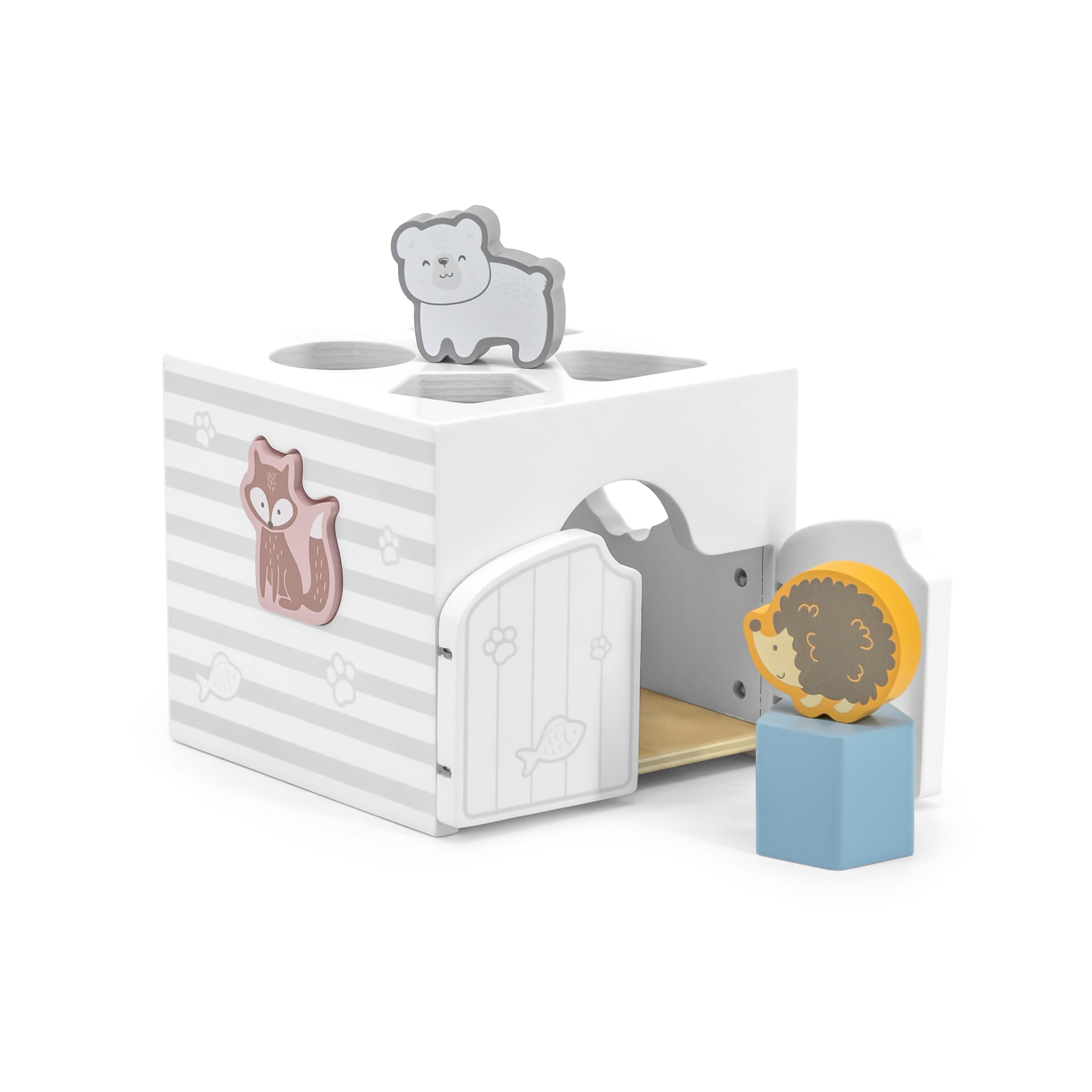 Zabawka w kształcie pudełka-kostki posiada wycięte otwory na klocki oraz drzwiczki do ich wyjmowania, zestaw 4 geometrycznych klocków-grzechotek i 3 klocków w kształcie zwierząt (lis, jeż, niedźwiedź polarny).