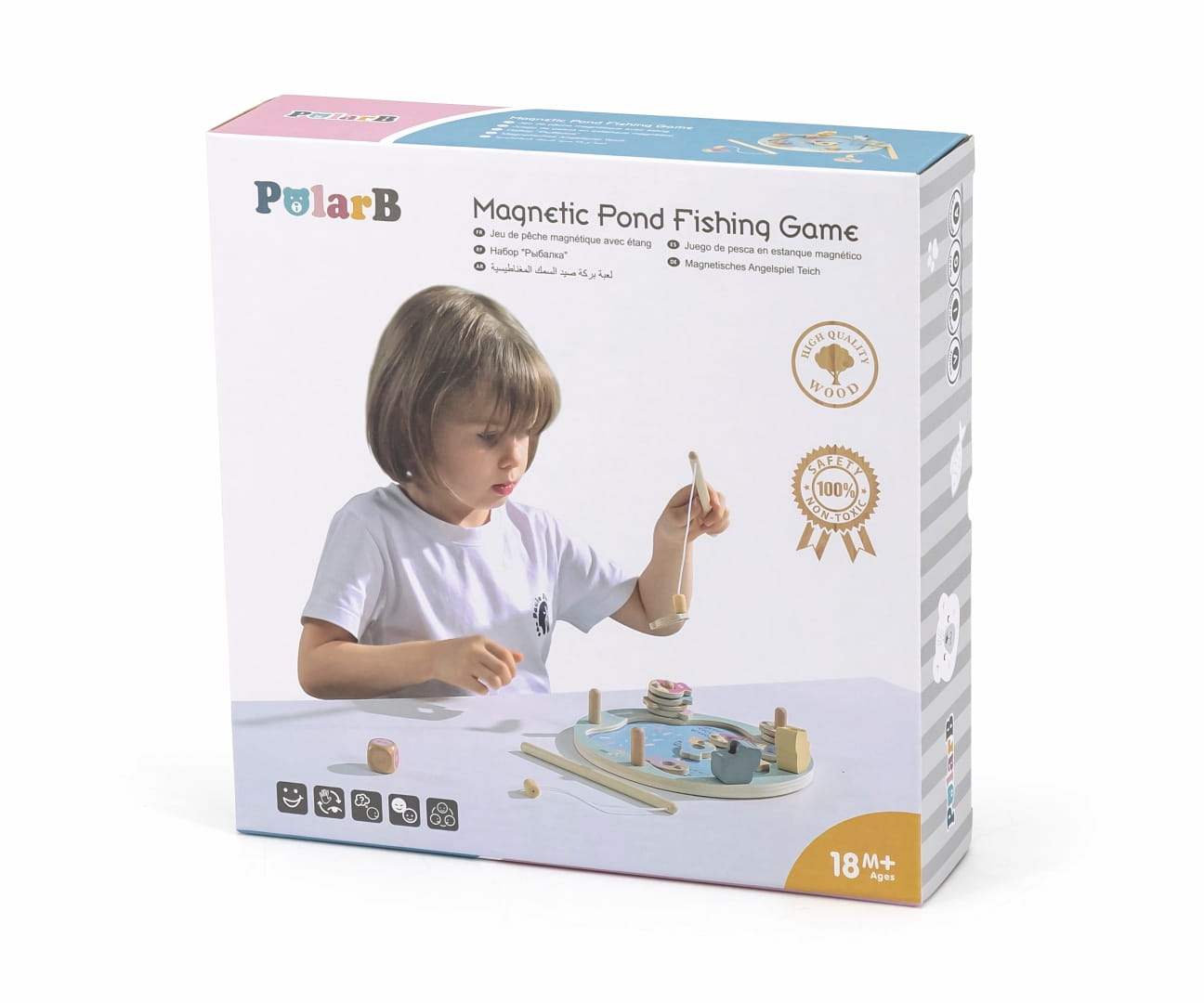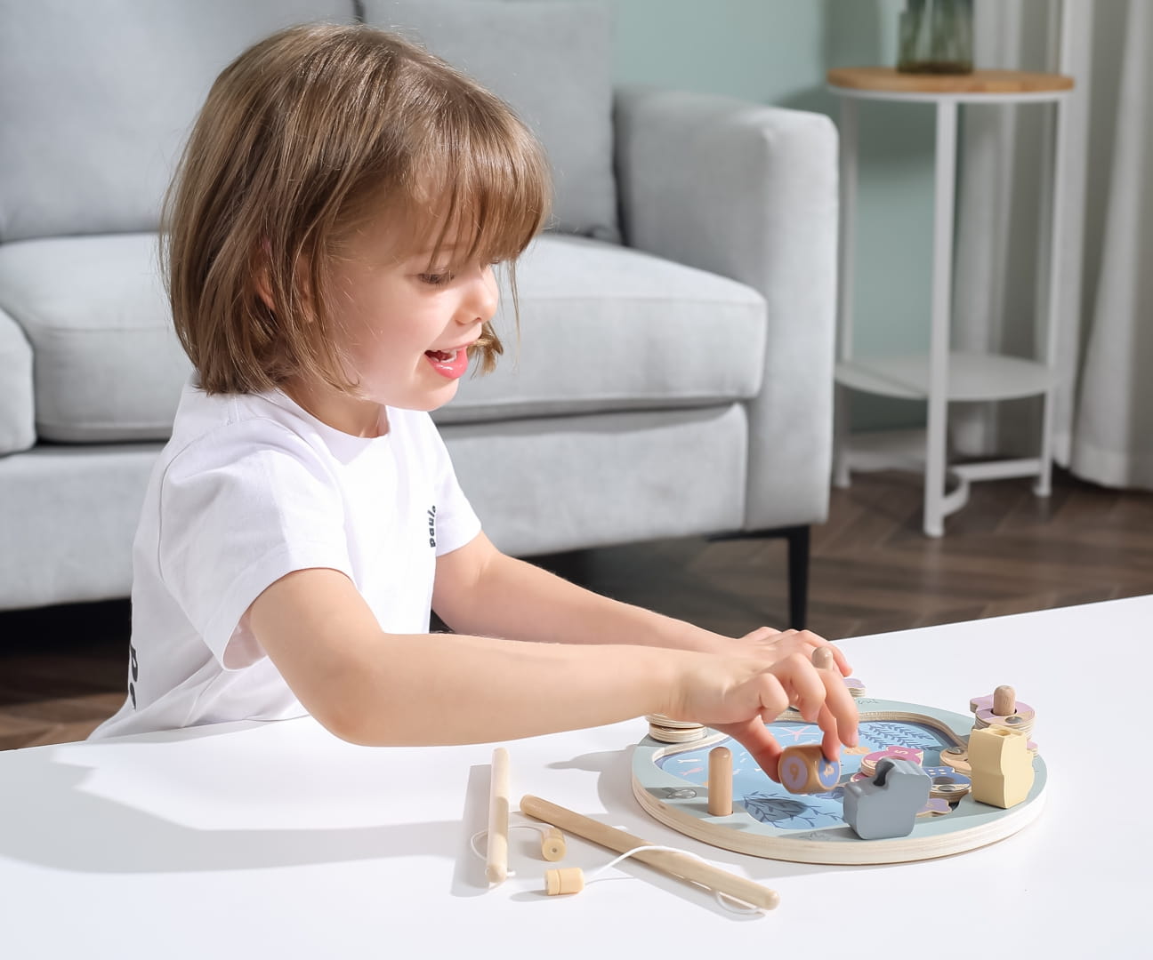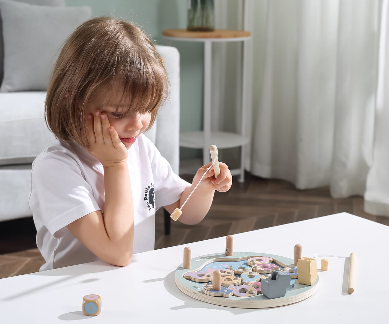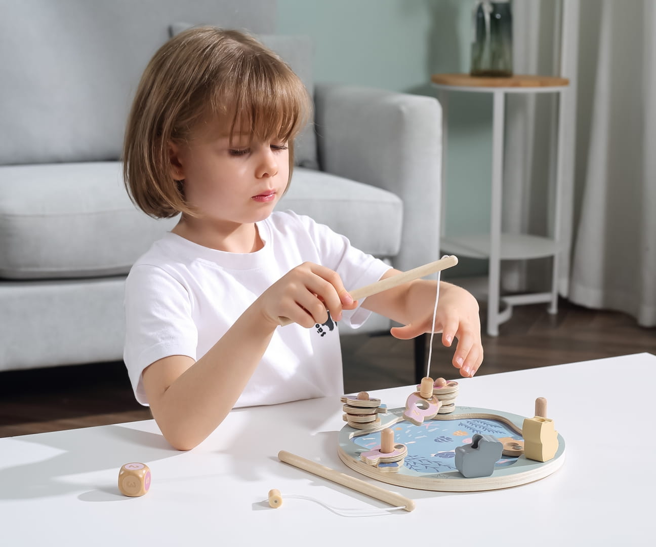Magnetyczna gra zręcznościowa składa się z dwunastu rybek (po dwie z cyframi od 1 do 6), jednej kostki i dwóch wędek. Rybki można rozróżnić po kolorze, cyferce lub ilości kropek jej odpowiadającej. Jest do wspaniałe narzędzie do nauki cyfr i kolorów. Dodatkowo, dziecko będzie rozwijało swoją: wyobraźnie, kreatywność, cierpliwość, motorykę oraz sensorykę i myślenie przestrzenne.
