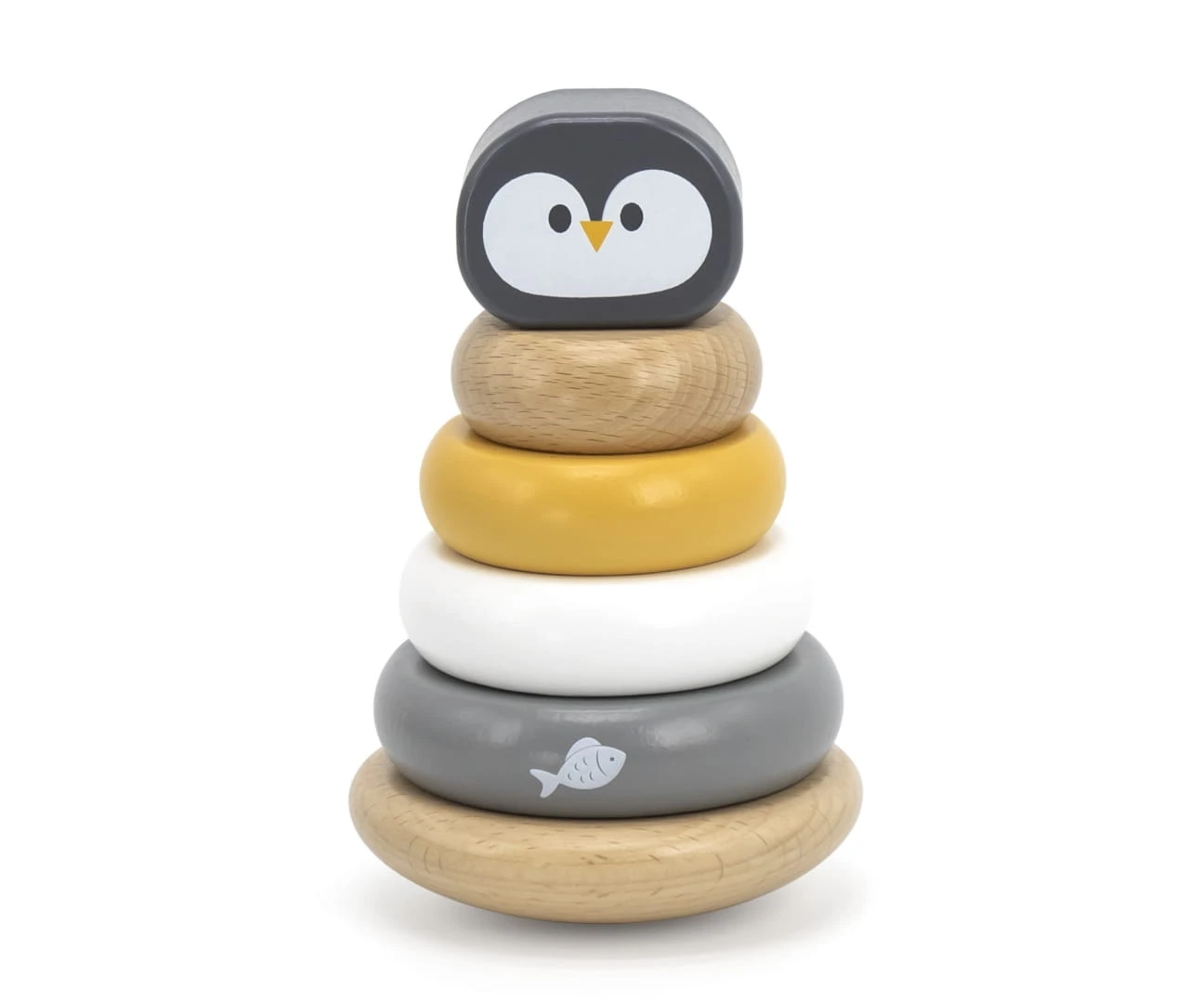 Dodatkowym elementem uzupełniającym zestawu jest drewniana edukacyjna Piramidka Pingwin od VIGA PolarB. Gdzie zadaniem dziecka jest umieszczenie na drewnianej o półokrągłej podstawie bazy z paliczkiem 5 kolorowych elementów w odpowiedniej kolejności, tak aby zachować równowagę piramidki.
