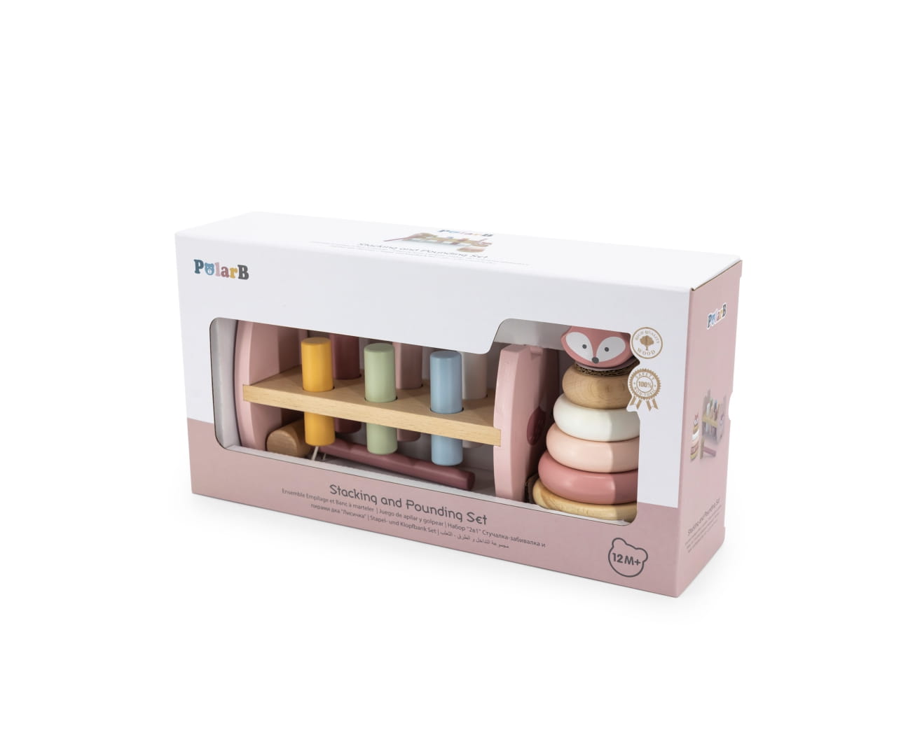 Pastelowy zestaw posiada jeszcze piramidkę składającą się z: 5 sztuk krążków-klocków w różnych rozmiarach, w tym jeden w kształcie główki Liska. W podstawie umieszczony jest bolec do nakładania elementów. Zabawka idealna dla maluszków rozpoczynających układanie wież z klocków.